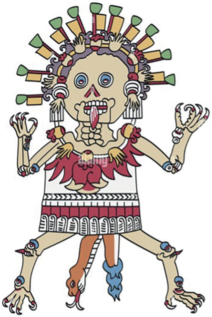 Cabe señalar que Vucub Caquix sugiere, en términos de género, ser una dualidad,6 ya que incorpora dentro de su masculinidad un rasgo femenino: la vagina dentada. En este caso adopta la forma de una cabeza de serpiente, lo cual es común en el contexto prehispánico. Un ejemplo de esto se encuentra en una lámina del Códice Magliabechiano (Figura 3) en la que se aprecia una tzitzimitl con una serpiente cascabel entre las piernas, similar a las ogresas de los relatos zoques y mixtecas, que tienen culebras en los genitales.7 Según Alizade, estas personificaciones equivalen a la proyección de temores ancestrales sobre el cuerpo de la mujer.8