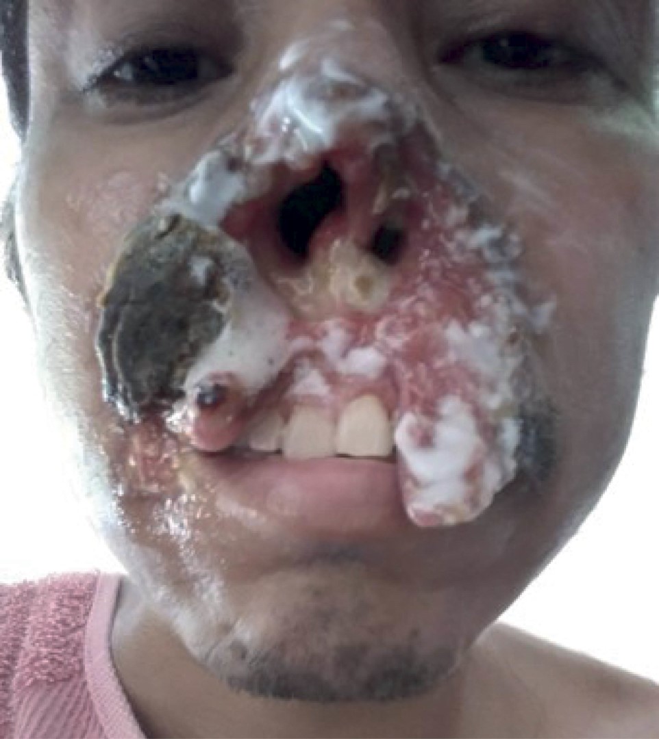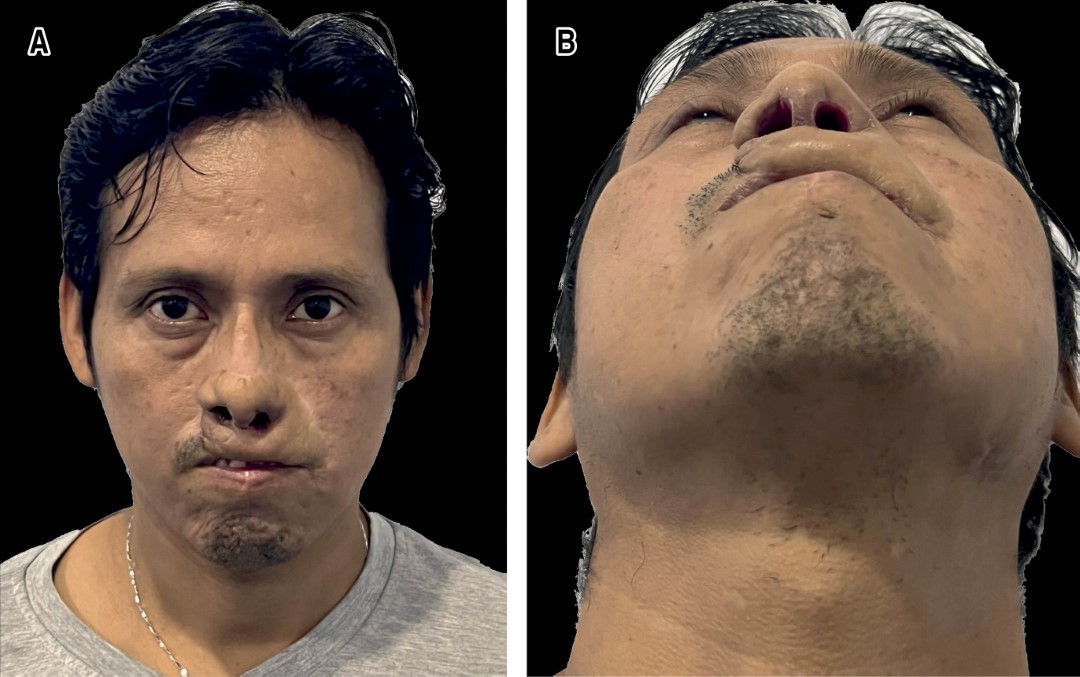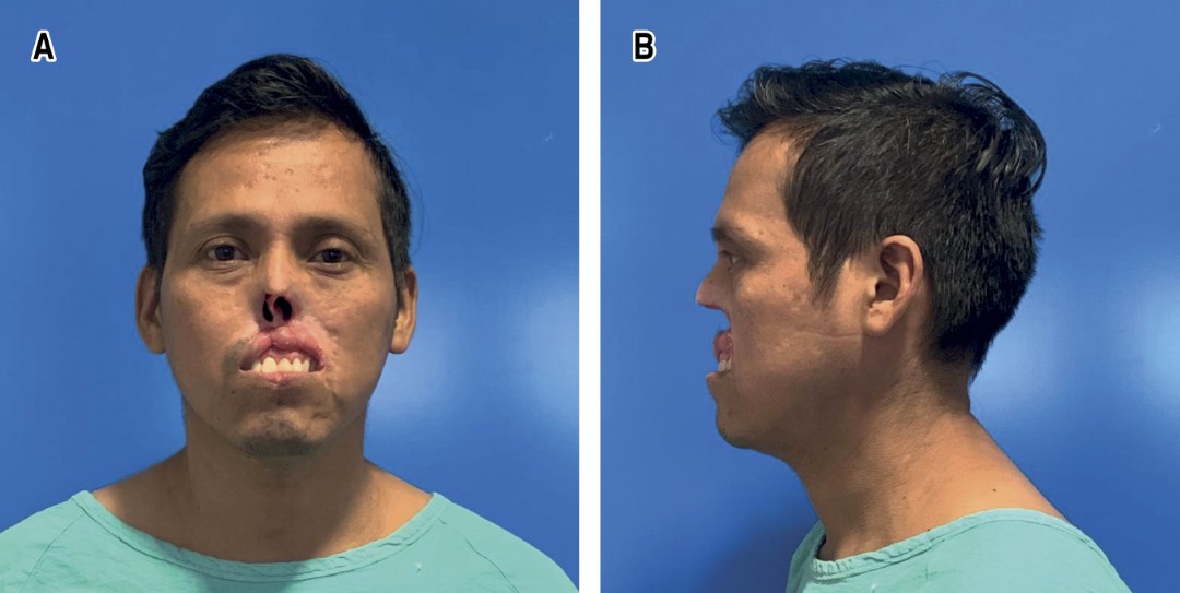 Se trata de paciente masculino de 43 años, con antecedente de importancia de ser portador del virus de inmunodeficiencia humana (VIH) desde hace 10 años, con linfoma nasofaríngeo de tres años de evolución (Figura 1), tratado mediante rinectomía y terapia adyuvante, lo cual condicionó distorsión importante de la región centrofacial (Figura 2).