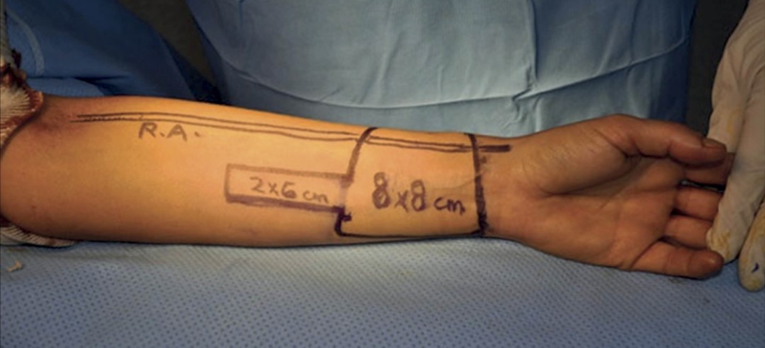 El colgajo radial de antebrazo es el más utilizado; dentro de sus ventajas se encuentran su pedículo largo, la posibilidad de recolección de colgajo sensitivo o de agregar componente óseo, dimensiones variables de paletas cutáneas, posicionamiento flexible del territorio cutáneo, aterosclerosis poco frecuente de la arteria radial y posibilidad de un acceso de dos equipos. Sin embargo, existen varias desventajas, como la deformidad notoria del sitio donante en el antebrazo, así como de posibles complicaciones como exposición del tendón secundaria a una mala absorción del injerto en el antebrazo distal, alta incidencia de una fractura postoperatoria del antebrazo si se recolecta componente óseo, sacrificio de la arteria principal del antebrazo, producción significativa de pelo en algunos pacientes y anatomía vascular variable.9,10