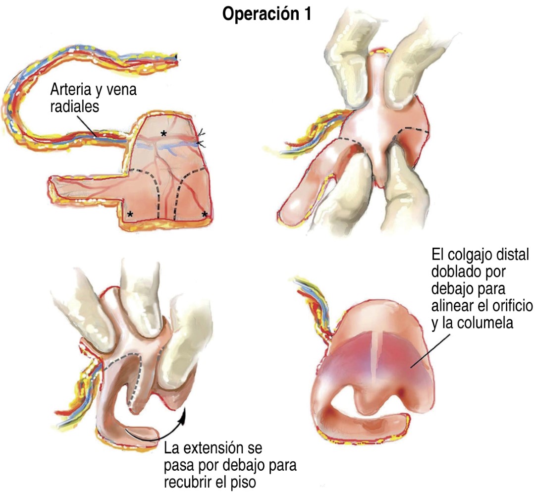 Los colgajos microquirúrgicos son la primera opción para la reconstrucción de defectos nasales totales. Se han descrito varios colgajos libres: colgajo radial de antebrazo, colgajo anterolateral de muslo, colgajo cubital de antebrazo, dorsal del pie y primer metacarpiano dorsal; cada uno con sus ventajas y desventajas.8