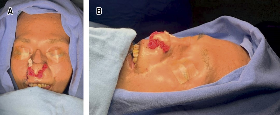 Se planteó la reconstrucción tomando en cuenta los aspectos éticos y la autorización y aprobación de consentimiento informado del paciente. En la primera etapa se realizó la cobertura externa mediante un colgajo microquirúrgico radial del antebrazo, la formación de un marco cartilaginoso como soporte estructural y la toma y aplicación de injerto cutáneo como revestimiento interno. En la segunda etapa se realizó la reconstrucción funcional con la formación de las narinas para la permeabilidad de las fosas nasales.