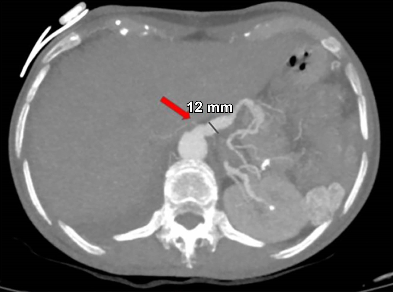 El aneurisma de la arteria esplénica (SAA) se define como una dilatación anormal de la arteria > 1 cm de diámetro, tiene una incidencia que va de 0.09 a 0.78% en reportes de autopsias de arteriografía, siendo una patología rara.1 Los factores asociados incluyen hipertensión, cambios hemodinámicos y hormonas como estrógeno, progesterona y relaxina.2,3 Con el incremento del uso de tomografías computarizadas (TC), la detección incidental de SAA se encuentra en aumento, siendo 80% de estos asintomáticos.