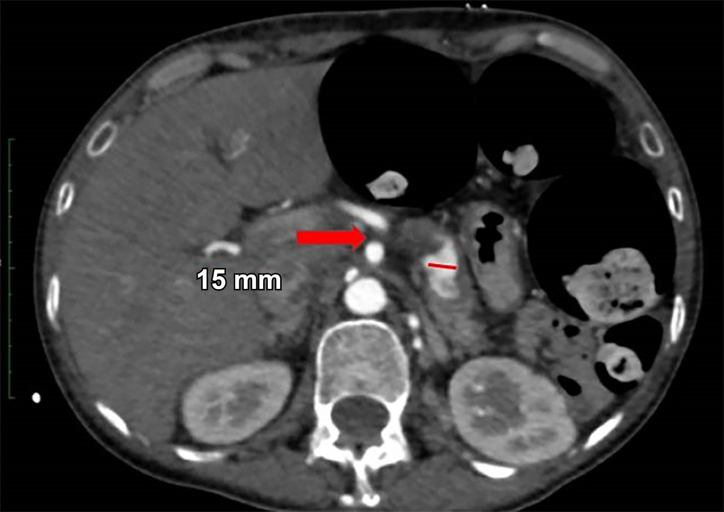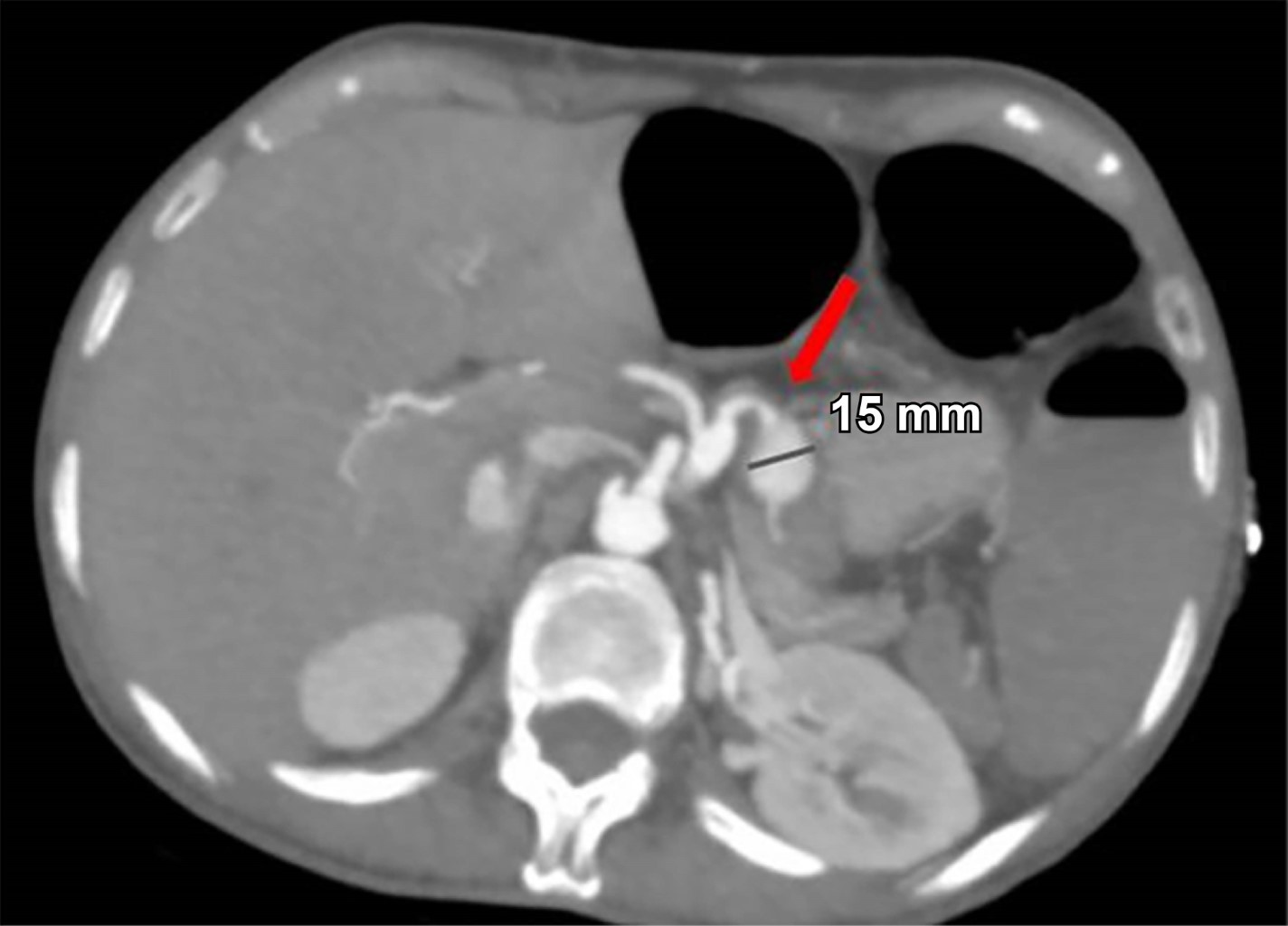 Mujer de 44 años quien 6 meses previos a su ingreso refiere disminución progresiva de la clase funcional debido a un soplo aórtico, por lo que se realizó cambio valvular con la necesidad de ser sometida a circulación extracorpórea y uso de vasopresores. Durante los primeros 10 días postquirúrgicos se diagnostica obstrucción intestinal, por lo que se realiza TC con hallazgo incidental de arteria esplénica (Figura 1) con dilatación aneurismática de hasta 12 mm, en un nuevo estudio de TC a las 24 horas (Figura 2) con ligero aumento del diámetro de aneurisma esplénico hasta 15 mm, pasadas 96 horas solicita nueva TC (Figura 3) y se evidencia mejor definición de la dilatación aneurismática de la arteria esplénica con diámetro actual de 15 mm (previamente de 12 mm). Con los hallazgos tomográficos previamente descritos, se pudo observar la evolución del proceso de dilatación aneurismática con ruptura contenida por el parénquima pancreático, la paciente cursó con un cuadro de obstrucción intestinal con desimpactación endoscópica y dolor abdominal, por lo que seguramente se enmascaró el cuadro clínico.
