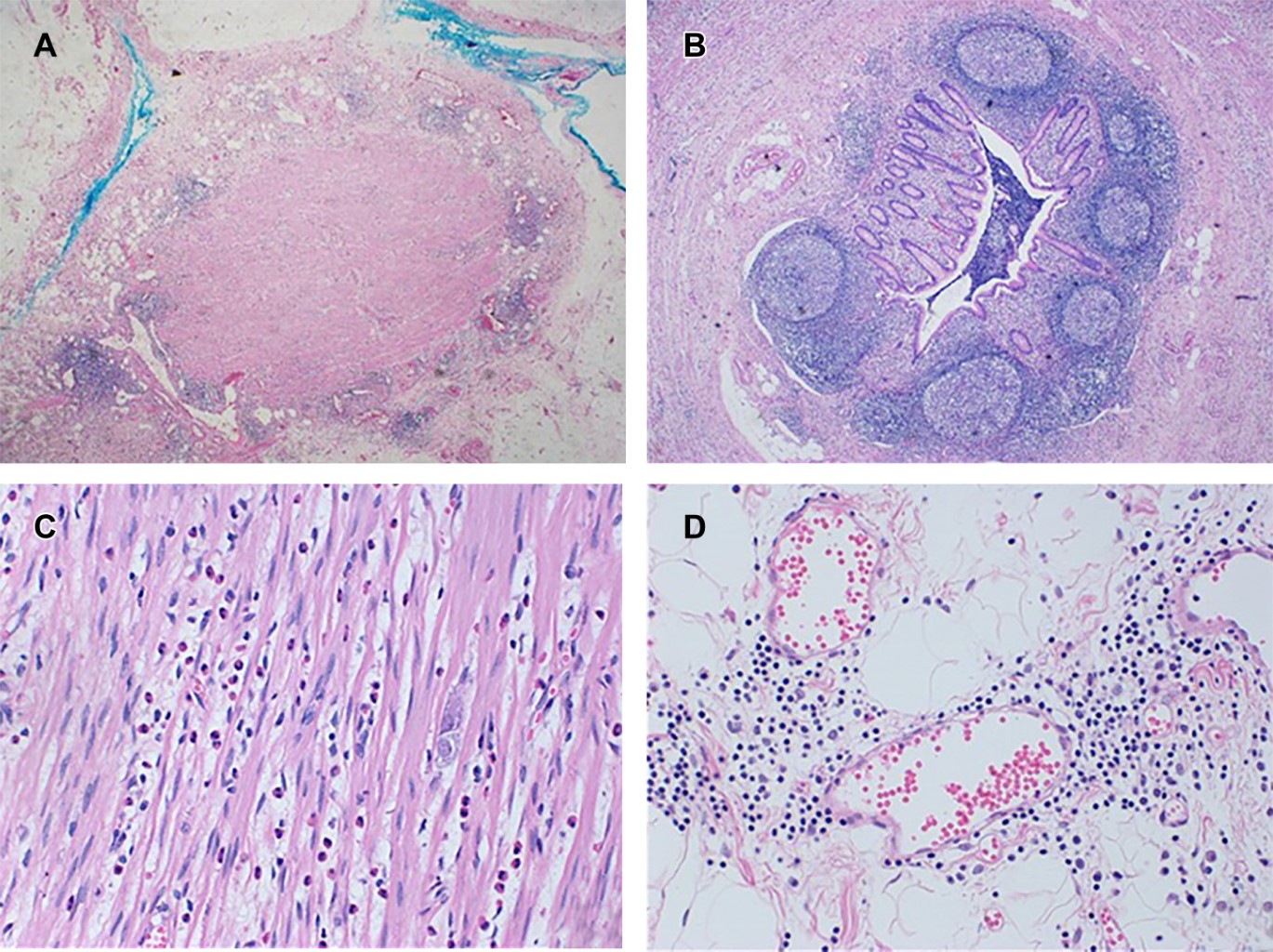 Mujer de 61 años de edad, sin antecedentes médicos de importancia que inicialmente fue abordada en consulta externa, en donde se le fueron solicitados laboratorios, leucocitos totales de 5.5 × 103 cel/μL y neutrófilos de 54.7% por presentar un cuadro de un mes de evolución de dolor abdominal tipo punzante localizado en hipogastrio, el cual se irradiaba hacia ambas fosas iliacas; tras presentar dolor abdominal nuevamente y que no mejoraba con el uso de analgésicos, la paciente acudió a urgencias, donde se le solicitó una tomografía axial computarizada abdominal, reportando un apéndice con aumento de tamaño, sin estriación de la grasa periapendicular, sin infiltración mesentérica, absceso o colecciones. En el examen físico se reportan signos vitales normales, dolor a la palpación profunda y superficial en hipogastrio y ambos flancos, sin tumoraciones palpables, prueba de McBurney, Psoas, Rovsing y Blumberg negativas. Se optó por un abordaje quirúrgico laparoscópico, con el hallazgo intraoperatorio de un apéndice cecal de 8.0 × 0.8 cm sin líquido libre en cavidad abdominal. El estudio histopatológico reportó imágenes correspondientes con una inflamación crónica (Figura 1). Durante su estancia hospitalaria la paciente no refirió dolor ni otros síntomas relacionados, por lo que la paciente fue dada de alta el siguiente día.