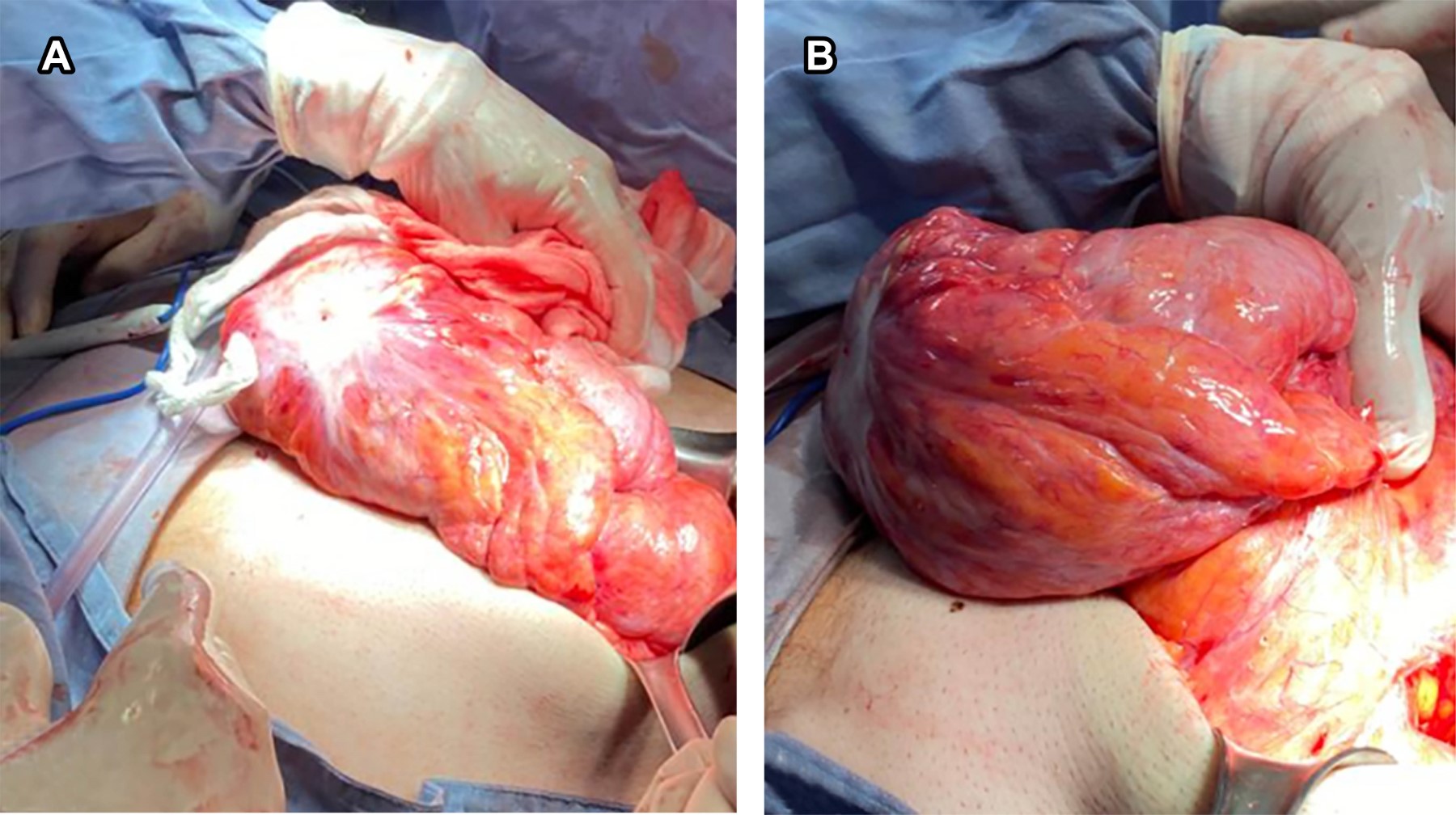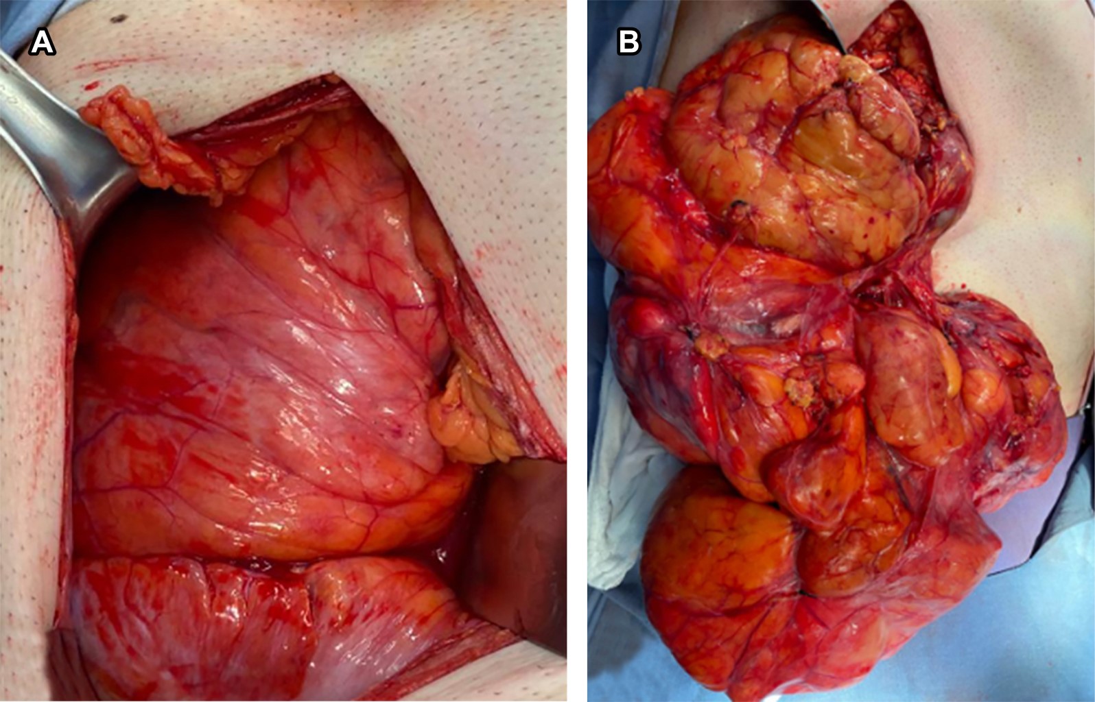 Se trata de paciente masculino de 68 años con antecedente de adenocarcinoma acinar poco diferenciado de próstata en etapa clínica I, tratado con prostatectomía por robot sin terapia adyuvante, cuatro meses después presenta distensión y dolor abdominal tipo cólico, intermitente, de intensidad leve, por lo que acude a urgencias. Se solicita TAC de abdomen (Figura 1), las imágenes eran compatibles con un liposarcoma, por lo que se procede a realizar laparotomía exploratoria. Al abrir se observa tumoración (Figura 2) y se realiza disección con energía avanzada, se observa gran tumor de 45 × 38 × 18 cm, desplazando todas las vísceras hacia la derecha (Figura 3), se efectúa cirugía R0 (cirugía sin tumor macroscópico residual) realizando resección de tumoración lipomatosa retroperitoneal sin otra estructura adyacente. No se realizó resección de colon. Tuvo una adecuada recuperación y se decide su egreso a los ocho días postoperatorios, con seguimiento en consulta externa sin presentar alguna eventualidad.