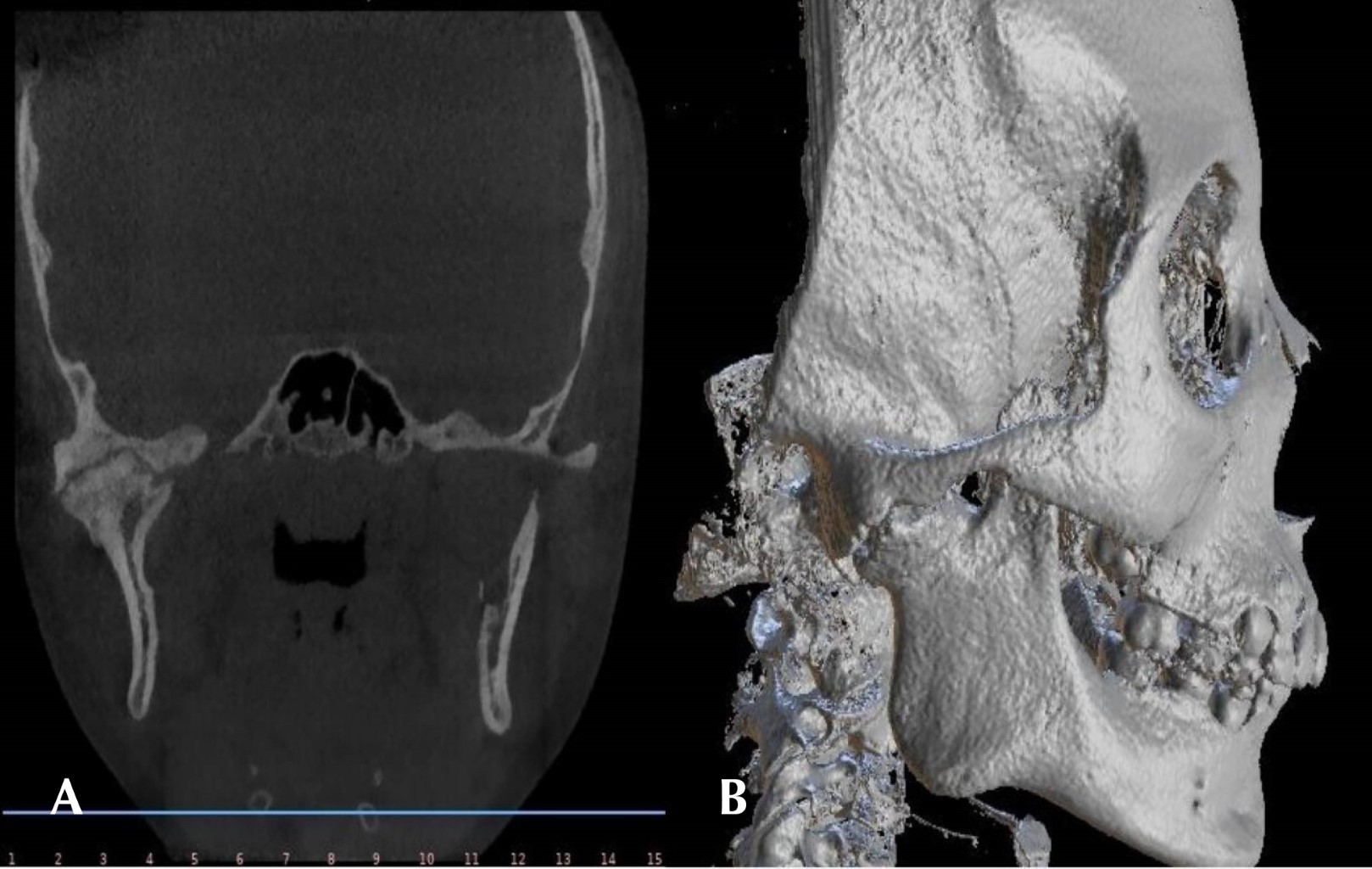 Se presenta paciente femenino de 10 años, al interrogatorio la madre refiere iniciar padecimiento actual al caer de una altura aproximada de dos metros a la edad de cinco años, ocasionando anquilosis de la articulación con disminución de la apertura bucal. Al examen clínico la madre negó alergias, comorbilidades y uso de medicamentos. Extraoralmente no se observaron signos de asimetría facial, a la exploración física e intraoral se encontró trismo severo, apertura bucal de 1 mm, dificultades masticatorias, maloclusión e higiene oral deficiente. Se realizó una tomografía computarizada donde se observa masa anquilótica que afecta la articulación temporomandibular derecha compatible con el tipo 2 de la clasificación de Shawney (Figura 1).