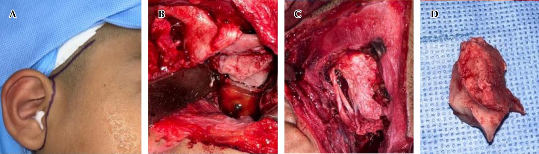 Bajo anestesia general, previa intubación con fibroscopio, se realizó abordaje preauricular, se realiza el marcaje de la incisión tipo Al-Kayat-Bramley con azul de metileno (Figura 2A) y se infiltra lidocaína con epinefrina a 2%. Se diseca por planos hasta exponer el cóndilo mandibular, se coloca guía quirúrgica y se realiza el corte y resección del cóndilo seguido de una coronoidectomía ipsilateral (Figura 2B y D), posteriormente se realiza la interposición con el colgajo del músculo temporal cubriendo la cavidad glenoidea (Figura 2C), se verifica hemostasia y se cierra por planos con vicryl 3/0 para planos profundos y nylon 6/0 para piel.
