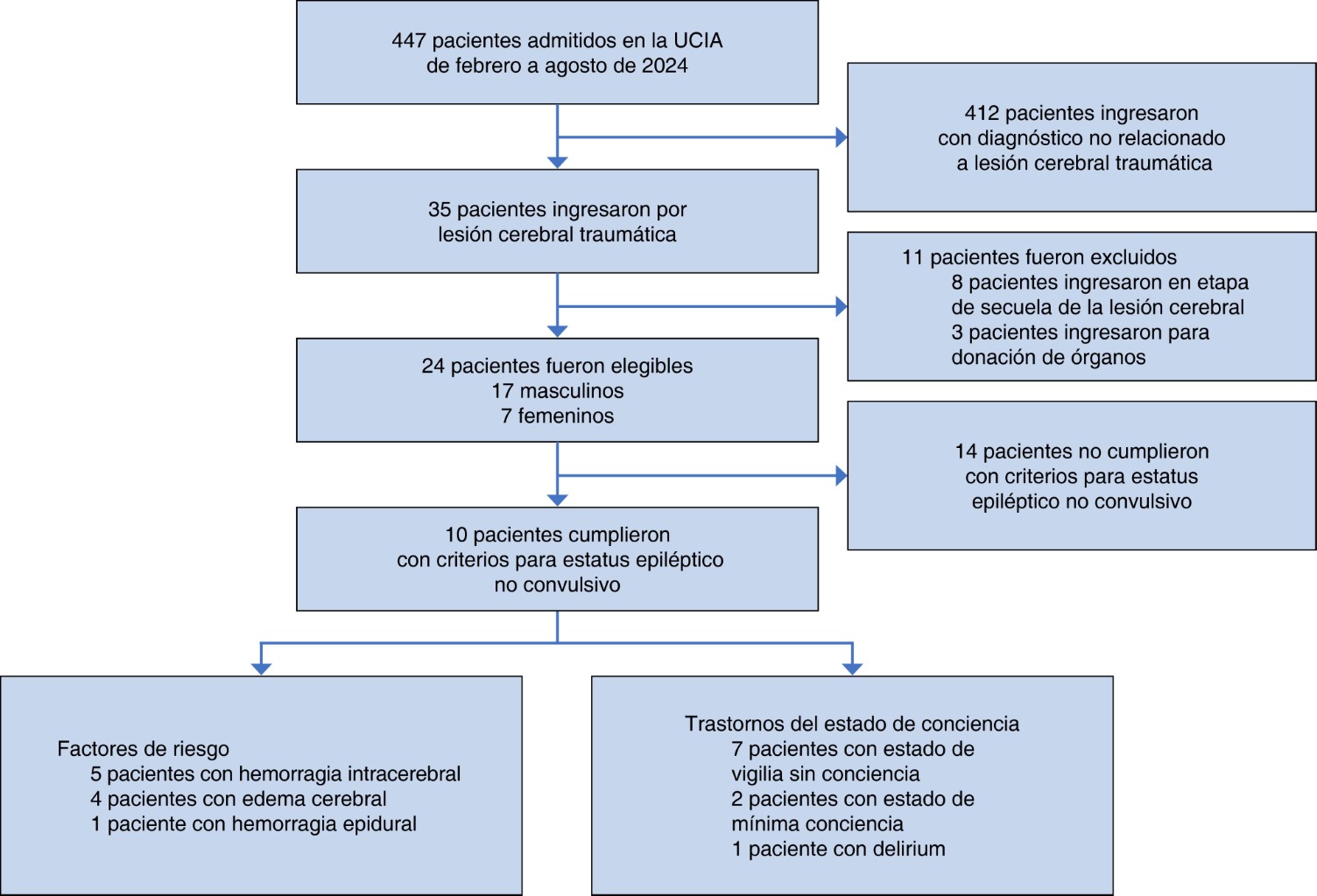 Entre febrero de 2024 a agosto de 2024 fueron admitidos un total de 447 pacientes a la unidad de cuidados intensivos, de los cuales 35 fueron compatibles con lesión cerebral traumática, siendo excluidos 11 pacientes por cursar con otro diagnóstico que implicara un deterioro neurológico aparte del traumatismo, ingresar al servicio en una etapa de secuela de su enfermedad cerebral o para procuración de órganos (Figura 1).