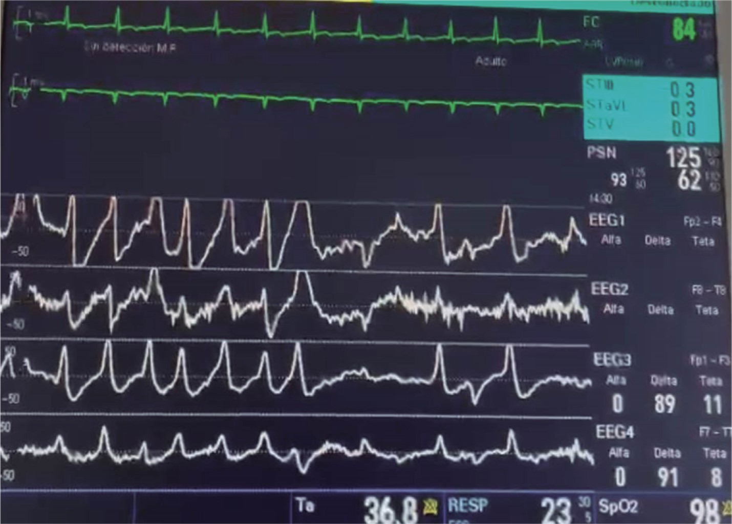 Se obtuvo una lectura continua con identificación de ritmos y patrones (documentados digitalmente), los cuales se interpretaron según la terminología estandarizada para electroencefalograma en cuidados intensivos de la Sociedad Estadounidense de Neurofisiología Clínica versión 2021.