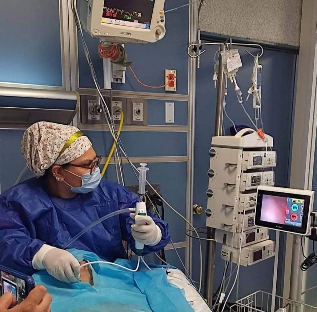 La técnica de LBA por broncoscopia (Figura 1) se realizó a través del tubo endotraqueal con el fin de llegar a los bronquios para obtención de la muestra. En pacientes bajo analgesia y sedación profunda con escala de agitación-sedación de Richmond (RASS, por sus siglas en inglés) −5, no se empleó mayor aporte de sedación o analgesia; no obstante, en pacientes despiertos, se utilizó 1 mg/kg intravenoso (IV) de propofol o 0.2 mg/kg IV de midazolam, así como analgesia a base de 200 a 400 μg IV de buprenorfina, para mejora del confort del paciente durante el procedimiento, así como uso de relajante muscular vecuronio IV 0.1 mg/kg si fuera necesario. Posteriormente, se colocó una boquilla en la arcada dentaria; además de instalar una válvula de PEEP en caso de que tuvieran una programación de PEEP extrínseco de 10 cmH2O o más en el ventilador en la inserción del tubo endotraqueal; para evitar la desaturación, se preoxígeno, con incremento del aporte de FiO2 al 100% antes y durante todo el procedimiento. Después se procedió a la inserción del videobroncoscopio flexible Ambu® de aScope™ de 6 mm de diámetro con canal de trabajo de 2 mm de diámetro, con dirección hacia la carina en donde encontramos la división entre el bronquio derecho y el izquierdo, iniciando con inserción en el derecho de primera instancia y posteriormente con el izquierdo con sus respectivas secciones de bronquios; una vez situados en la luz del bronquio, se aspira directamente si hay suficientes secreciones y/o se cargan 20 mL de solución salina al 0.9% en 3-5 jeringas de 20 mL y se instilan de 20 a 100 mL de la misma solución para ser aspirados por el broncoscopio hacia la trampa, ya previamente conectada hacia la succión, y de ahí obtener una alícuota del LBA de la trampa con técnica estéril, para darse finalizado el evento.