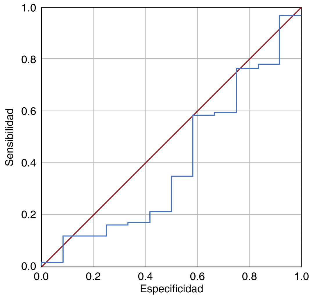 Desempeño del índice neutrófilo/linfocito. Para el cálculo de la sensibilidad y especificidad se convirtieron las variables cualitativas a cuantitativas, alto y bajo riesgo, para el índice neutrófilo/linfocito fue de 6.7 y al presentar una diferencia estadística en el grupo de defunción en esta variable se toma como estándar de oro y para la NUTRIC Score de 5. Se obtiene una sensibilidad de 52.8%, especificidad de 65.3%, con valor predictivo positivo de 85.9 y valor predictivo negativo de 25.7. El punto de corte para el índice neutrófilo/linfocito en este estudio fue 6.7, se toma de la mediana de la variable, considerando que es la mitad de los datos, se calcula la exactitud del índice neutrófilo/linfocito, la cual fue de 55%. Finalmente, por medio del análisis de curva ROC, se obtuvo como punto de corte para el índice neutrófilo/linfocito de 2.05 con sensibilidad de 90.7% y especificidad de 91.7% (Figura 2).