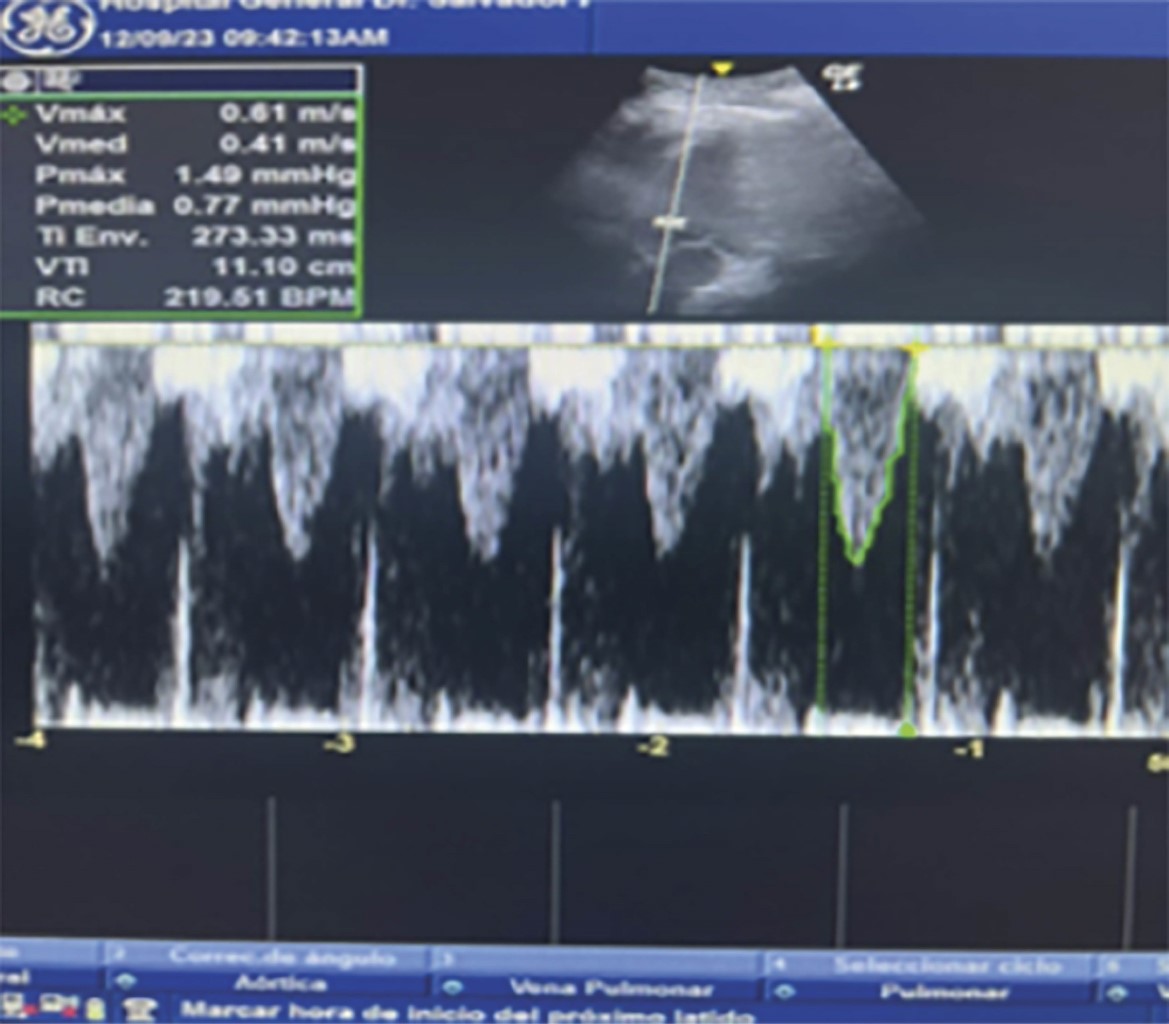 Durante su evolución, se evidencia deterioro hemodinámico con aumento de requerimiento de vasopresores con disminución de SvO2, en la ecocardioscopia se observa hipocinesia del ventrículo izquierdo con una integral velocidad tiempo de 11.1 cm/s, y diámetro de tracto de salida del ventrículo izquierdo de 1.65 cm, con gasto cardiaco de 2.38 L/min (Figura 1 y 2) como deterioro del estado ácido-base con presencia de acidosis metabólica de anión gap elevado (Tabla 3) concomitante con acidosis metabólica de anión gap normal.