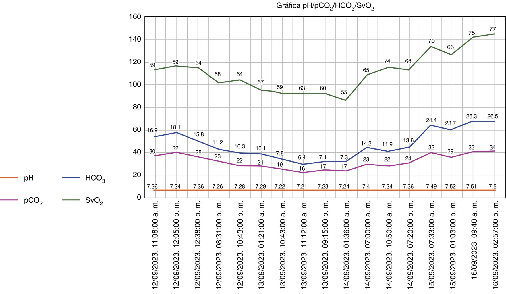 Se inicia reanimación hídrica por vía central y con tratamiento antibiótico a base de doxiciclina con dosis carga de 200 mg. A su llegada a la unidad de cuidados intensivos se evidencia acidosis metabólica descompensada (Winters 34) (Tabla 2).