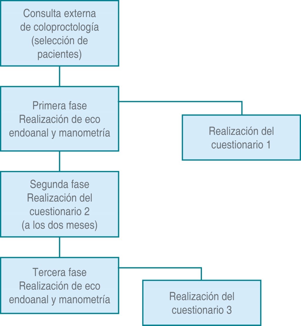 Primera fase: se realizó a todo paciente con diagnóstico de ano húmedo, ultrasonido endoanal 3D y manometría anorrectal, concomitantemente con cuestionario de Calidad de Vida en Incontinencia Fecal (FIQL) (Anexo 1), se inician los ejercicios inmediatamente después de los estudios y cuestionarios.