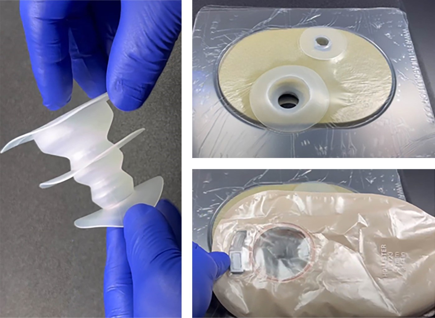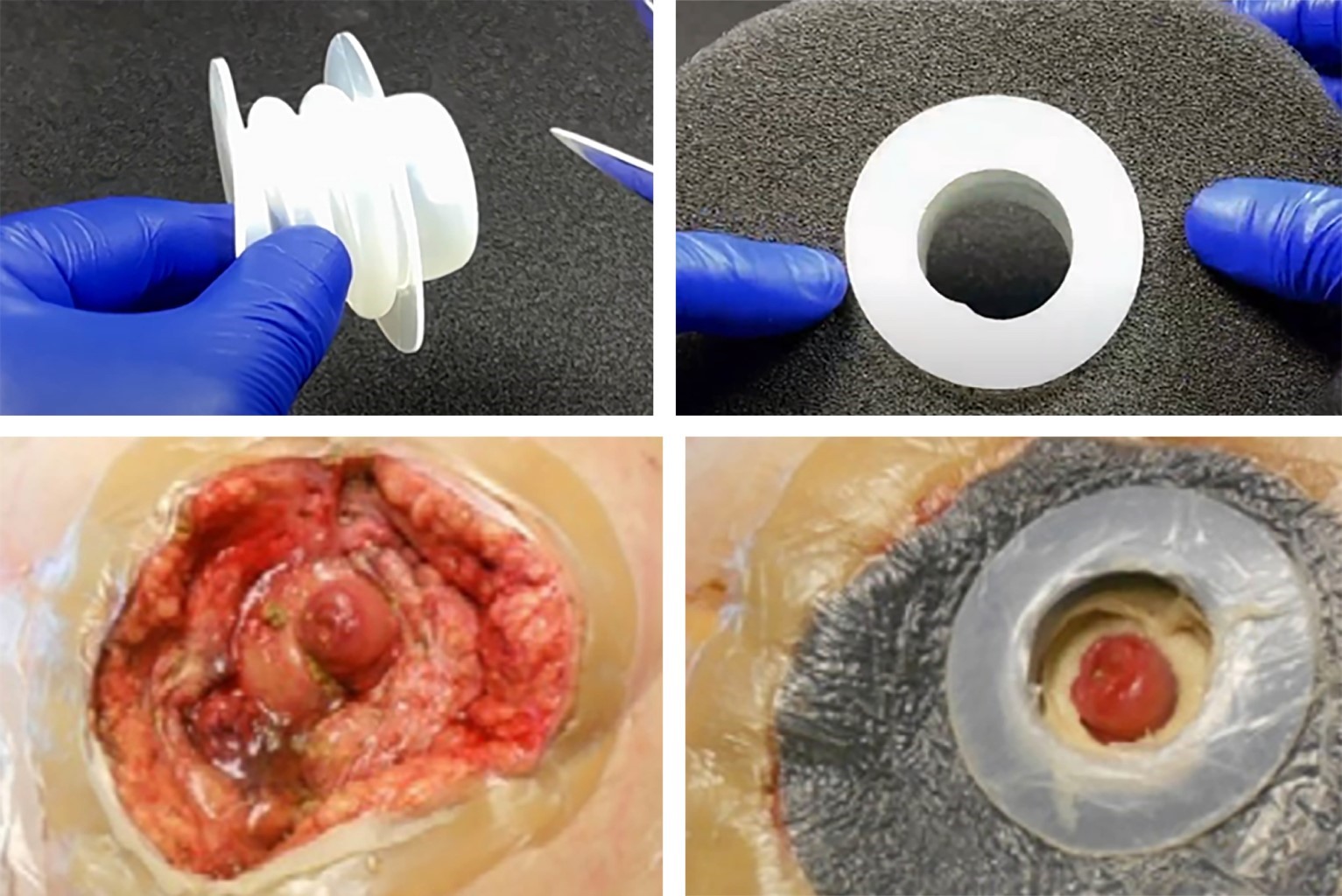 El embudo es un dispositivo de barrera que se coloca al borde de la fístula y tiene como objetivo el sellar y fijarse a la periferia de esta, este es flexible y tiene diámetros desde 4 cm a 1.5 cm, puede ser cortado según el diámetro fistuloso, y puede ser colocado a través de un sistema de presión negativa, drenando directamente el contenido de la fístula hacia una bolsa de colostomía, a la vez que el sistema de presión negativa ayuda a la granulación de la herida; sin embargo, muchas veces el problema es el trayecto fistuloso que no es recto, aunado al contenido espeso, la peristalsis muchas veces termina expulsando el embudo (Figura 1).
