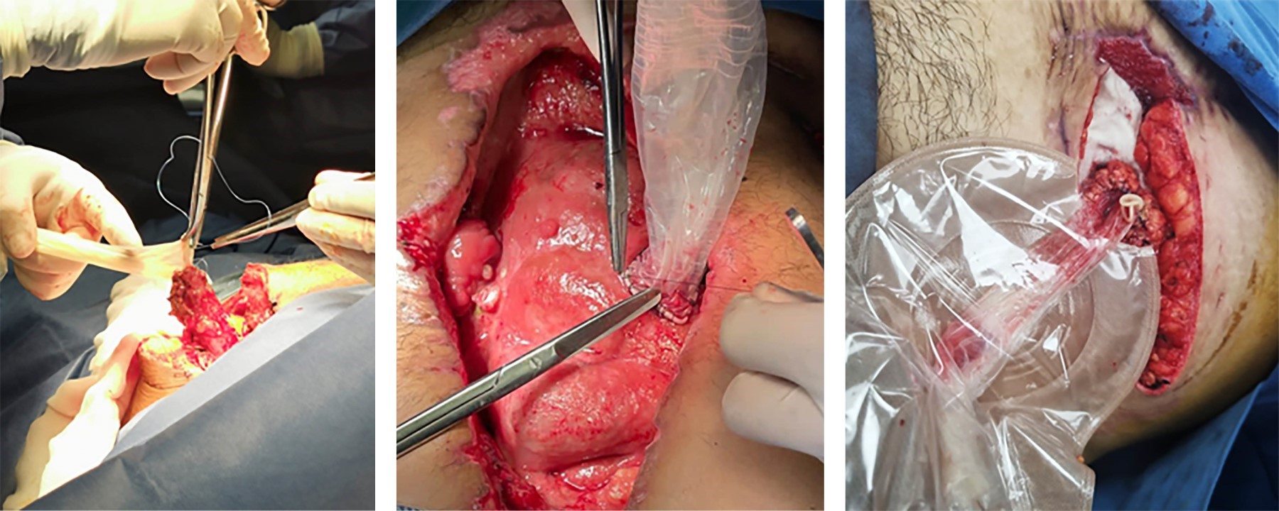 Este es simplemente un condón sin desenrollar, cumpliendo una función de domo, en un segmento intestinal el cual tiene una perforación en el borde antimesentérico (Figuras 8 y 9), donde hay un cabo proximal y uno distal unidos por el borde mesentérico del asa intestinal, con el fin de asegurar la continuación del tránsito intestinal sin fuga de material hacia la herida con salida al final por la fístula terminal que estará siendo derivada con un condón, asegurando así la mayor longitud de intestino funcional disminuyendo el riesgo de desequilibrio hidroelectrolítico, deshidratación y desnutrición, incluso con un adecuado control de estos puntos, estas perforaciones tienden a reducir su diámetro, cuando esta sea menor a 2 cm, podemos retirarlo y colocar una sonda tipo Foley cada vez de un calibre menor.