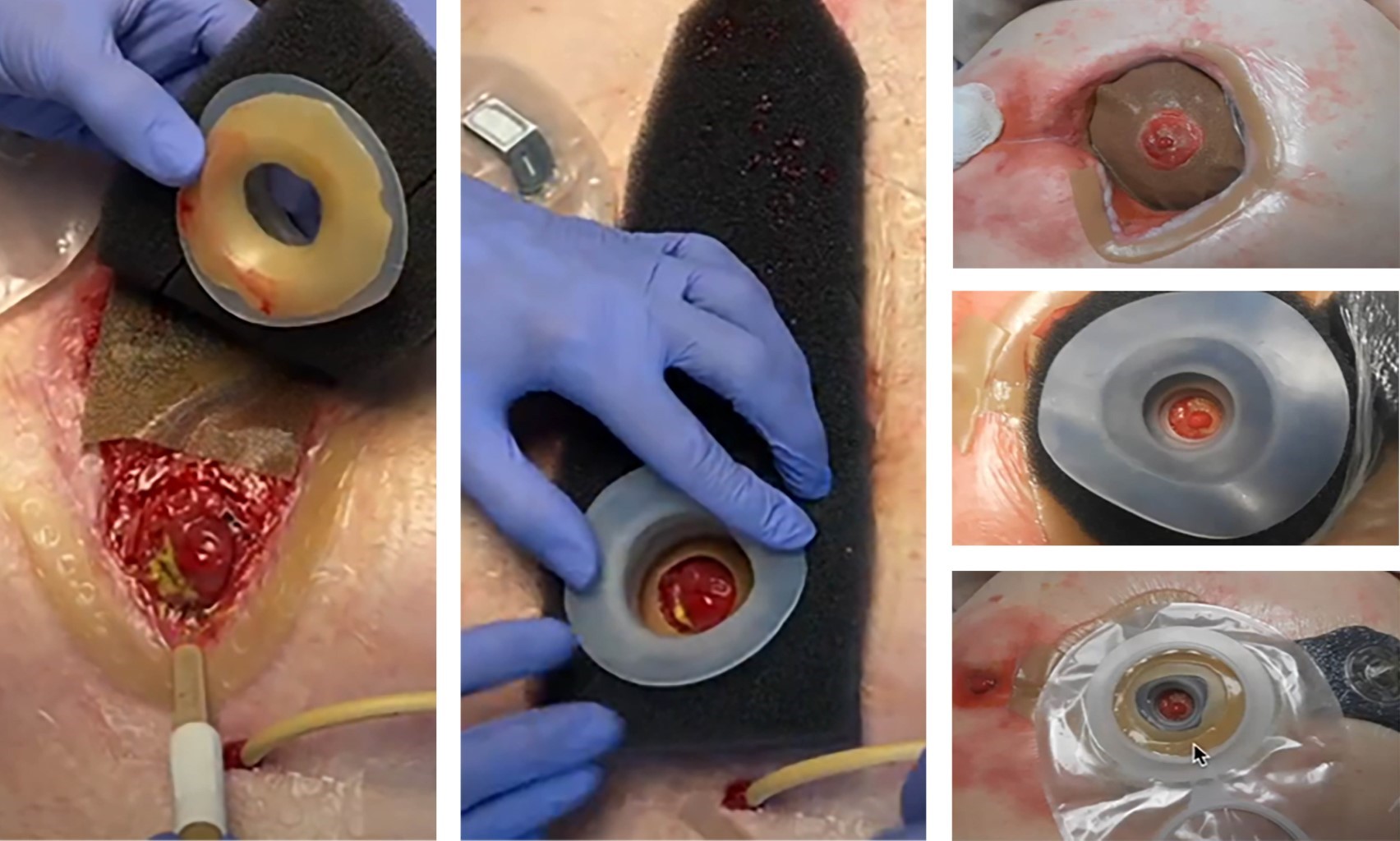 En ocasiones al tener un abdomen congelado y granulado, con una fístula intestinal establecida, pero desfasado de la piel, donde no se logra colocar una bolsa de colostomía, optamos por técnicas como colocar parches hidrocoloides o llenar el espacio con karaya; sin embargo, no termina siendo una técnica efectiva porque el líquido continua fugándose, por lo que el condón en estos escenarios continúa siendo la mejor técnica, incluso el tejido de granulación al no estar sufriendo por la quemadura química del líquido intestinal termina por llenar ese espacio y llegar al nivel de la piel, donde podremos ahora sí colocar un parche hidrocoloide y una bolsa de colostomía.