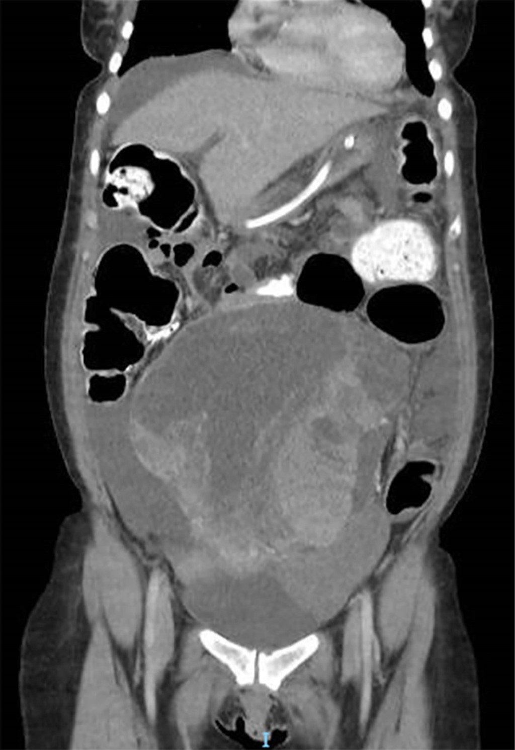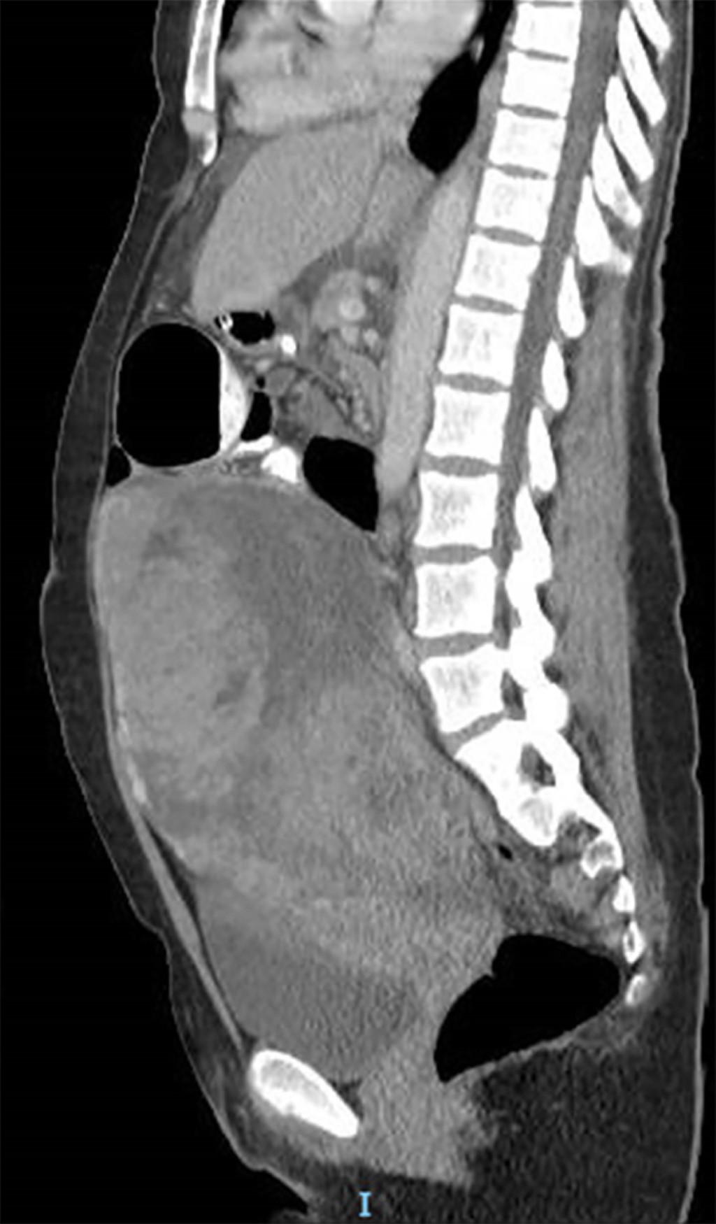 Se presenta una mujer de 51 años, con antecedentes de VIH sin adherencia al tratamiento antirretroviral, quien consultó por dolor abdominal difuso de tres meses de evolución y constipación en los últimos 10 días. En el examen físico, se evidenció abdomen distendido con falta de eliminación de gases sin signos de irritación peritoneal. Presentaba un tumor palpable en hipogastrio que se extendía hasta la región umbilical. En el laboratorio se objetivó una elevación del antígeno CA-125 (153 U/mL; valor normal hasta 35 U/mL), con el resto de las determinaciones dentro de los parámetros normales. La tomografía abdominopelviana con contraste oral y endovenoso reveló una voluminosa formación centro pélvica de 28 × 12 × 12 cm asociada a ascitis, distensión del marco colónico y progresión del contraste oral hasta colon sigmoides (Figuras 1 y 2).