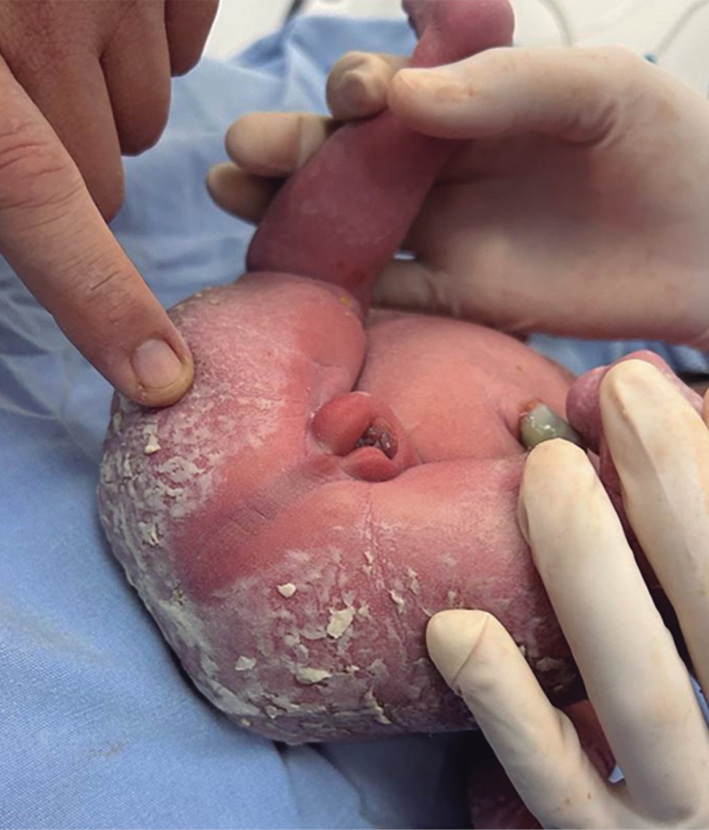 Se trata de recién nacido del sexo femenino producto de la gesta 1, obtenido mediante cesárea. Madre con mal apego al control prenatal, con una sola consulta prenatal y un ultrasonido obstétrico con detección de polihidramnios sintomático severo a las 35 semanas de gestación, diabetes gestacional diagnosticada en misma consulta, resonancia magnética de útero a las 32.2 semanas de gestación con reporte de múltiples malformaciones congénitas: cordón umbilical con únicamente 2 vasos, ectrodactilia de pie izquierdo, mesomelia de miembro pélvico izquierdo, probable atresia duodenal vs estenosis duodenal, dilatación de asa intestinal y hemivértebra torácica.