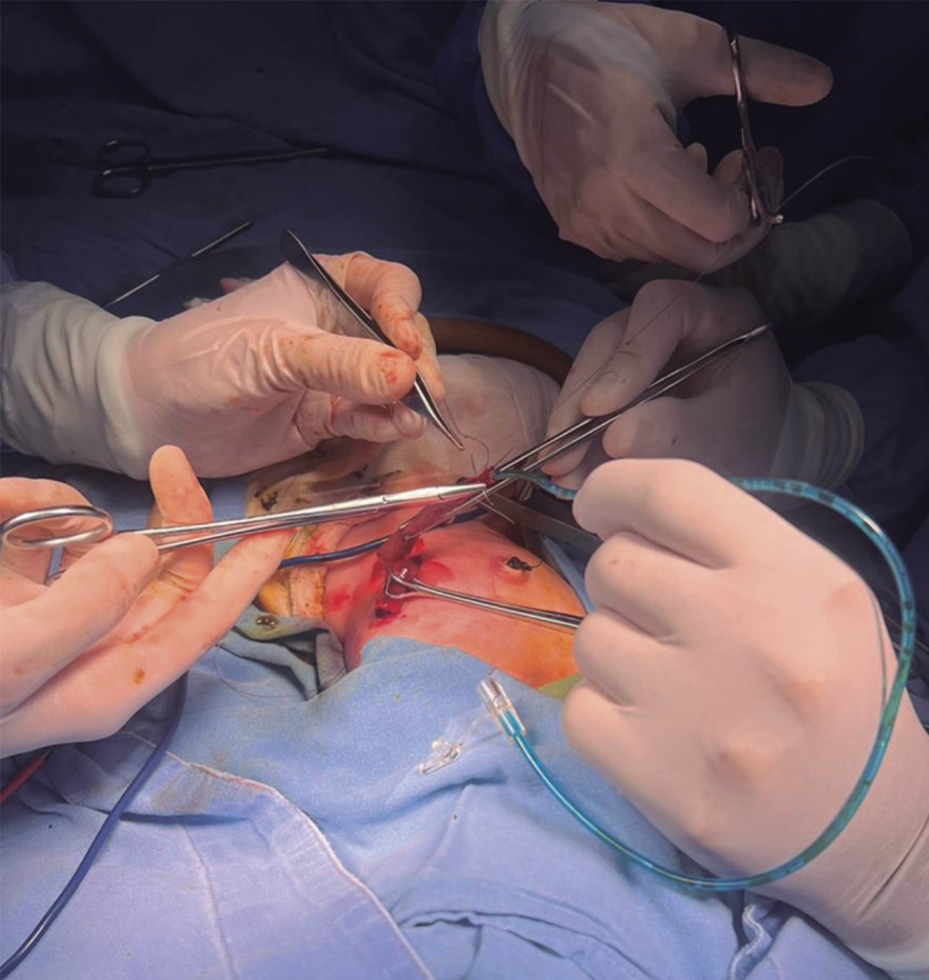 Por las múltiples malformaciones se solicitó interconsulta al servicio de cirugía pediátrica ocho horas posteriores a su nacimiento, se sometió a procedimiento quirúrgico en sus primeras 24 horas de vida extrauterina donde se efectuó laparotomía exploratoria más realización de colostomía más anastomosis gastroduodenal, bajo anestesia general; se colocó al paciente en decúbito dorsal con previa antisepsia de cuello, tórax, abdomen, genitales y muslos, en primer tiempo quirúrgico se realizó abordaje abdominal con incisión inicial transversa en flanco izquierdo a nivel umbilical de aproximadamente 3 cm, se disecó por planos hasta ingresar a la cavidad abdominal, se exteriorizó y examinó el intestino delgado y grueso con el fin de descartar probables sitios de fístula, sin identificar sitios de la misma se procedió a realizar colostomía, se identificó colon descendente y se realizó pinzamiento con pinzas babcock en su extremo proximal y distal, se realizó liberación de mesocolon (Figura 3); se efectuó colectomía y exteriorización de colostomía hacia flanco izquierdo, se fijó a aponeurosis en su cabo distal con puntos simples (Figura 4) y se realizó maduración de estoma con técnica de Brooke modificada, se confirmó la funcionalidad del estoma sin presentar complicaciones.