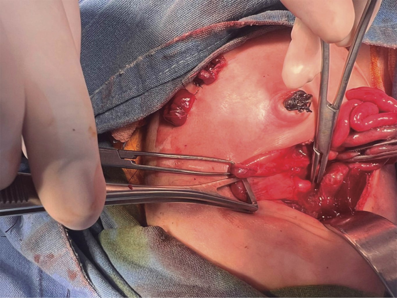 En segundo tiempo quirúrgico se realizó nuevamente antisepsia abdominal para abordaje de la atresia duodenal, se realizó incisión transversa de aproximadamente 5 centímetros a nivel de hipocondrio derecho, se disecó por planos hasta entrar en cavidad abdominal, se exteriorizó el intestino delgado hasta identificar duodeno y vía biliar, con presencia de estómago bastante distendido, al no permitir una adecuada visualización de duodeno se realizó maniobra de Kocher para liberarlo, se observó brida a nivel de la primera porción duodenal, se disecó de manera roma con pinzas mosco hasta liberar el duodeno (Figura 5), se realizó gastrostomía longitudinal de aproximadamente 1.5 cm y se introdujo sonda de alimentación orotraqueal del número 8 para ver permeabilización y paso hacia duodeno, con imposibilidad de paso de la misma. Se realizó duodenotomía transversa distal al sitio de probable estenosis, donde se evidenció engrosamiento de la paredes duodenales con disminución abrupta de la luz duodenal; se decidió realizar anastomosis gastroduodenal para permitir paso del contenido gástrico distal a sitio de estenosis duodenal, se elaboró anastomosis con duodenotomía distal en diamante y se afrontó a serosa estomacal con sutura absorbible (vicryl) 5-0. Se determinó la funcionalidad por medio del paso de sonda de alimentación instilando solución fisiológica que mostró adecuada funcionalidad de la misma.