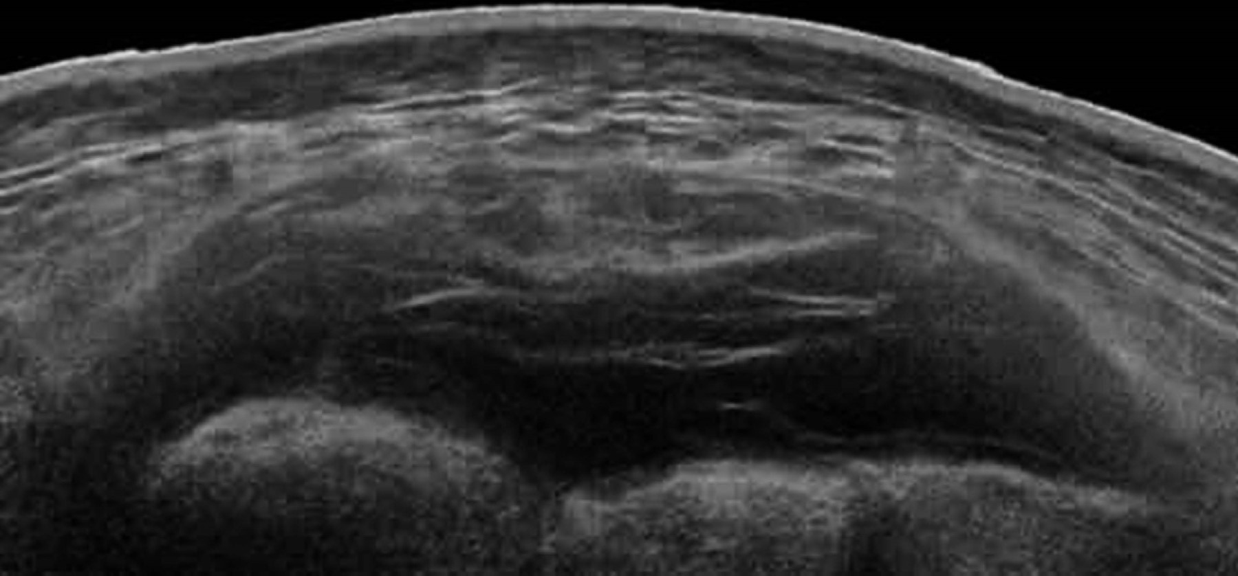 En radiografías simples de pelvis se identificó una fractura de la rama inferior de pubis izquierdo, el ultrasonido (USG) de tejidos blandos reveló una acumulación de líquido hipoecogénico entre el tejido celular subcutáneo y la fascia con dimensiones de 14 × 60 × 95 centímetros para un volumen de 426 ml, lo que indicaba una posible LML lumbar (Figura 1). La tomografía reveló una colección de líquido hipodenso, unilocular, entre la fascia y el tejido celular subcutáneo, con un volumen similar.