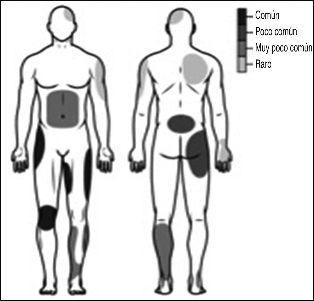La LML es una entidad relativamente rara, se describe como una lesión cerrada producida por un efecto de cizalla que separa el tejido celular subcutáneo y la fascia, causando ruptura de los vasos de menor calibre y los vasos linfáticos, esto conlleva acumulación de material hemático y linfático en un tercer espacio recién formado.2 Las localizaciones más frecuentes son la cadera (30.4%), pelvis (18.6%), rodilla (15.7%), glúteo (6.4%), pared abdominal (1.5%), pierna (1.5%) y cabeza (0.5%) (Figura 2).1 Algunos autores sugieren que la predilección de la LML de ocurrir en ciertas regiones está relacionada a una variación en las estructuras anatómicas de los tejidos adiposos. Las capas más profundas tienen una estructura más débil, especialmente en la región glútea y la cadera en mujeres. Estas variaciones en la anatomía del tejido subcutáneo explican por qué la región glútea y cadera son las más implicadas, mientras que la región lumbar se encuentra raramente afectada. En nuestra paciente debido a la zona del traumatismo, la lesión se produjo en la región lumbar. La mayoría de los casos de LML reportados incluye pacientes masculinos jóvenes y con trauma severo.8