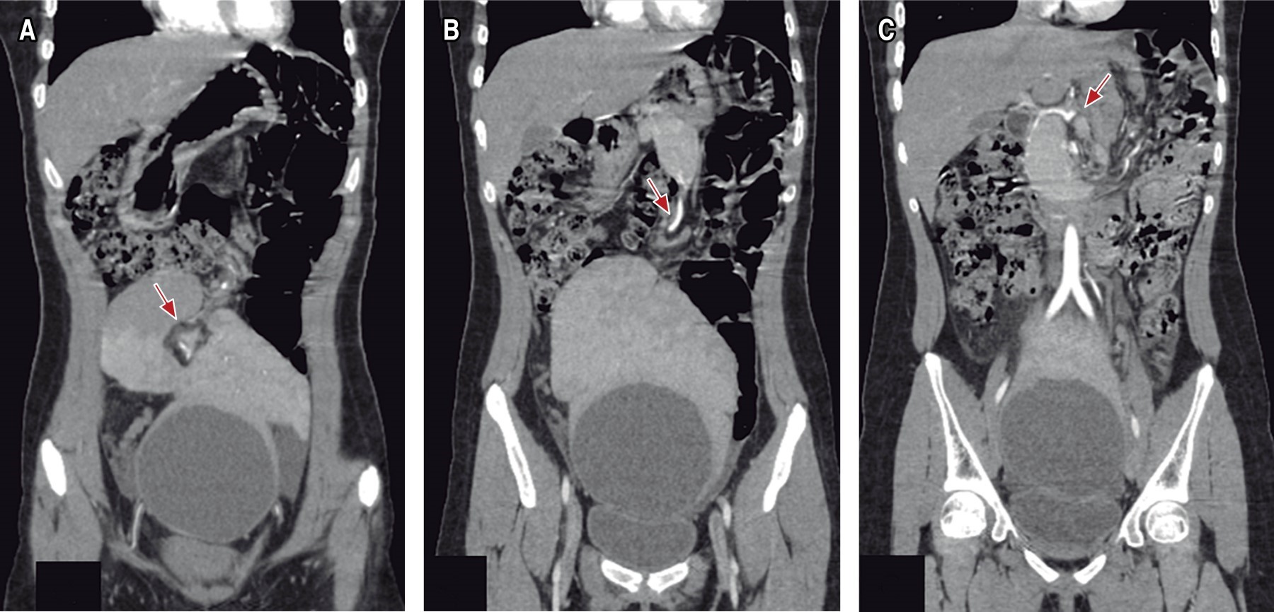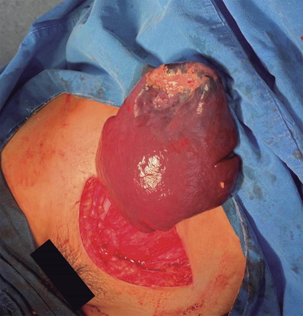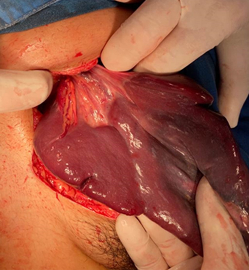 A la exploración física se logra palpar tumor delimitado, móvil, de aproximadamente 9 × 8 cm en cuadrante inferior izquierdo, sin datos de irritación peritoneal, se complementa abordaje con laboratorios en los que se reporta biometría hemática y química sanguínea dentro de parámetros normales, Ca-125 17 U/ml, tomografía abdominopélvica que reporta imagen compleja dependiente de ovario izquierdo (Figuras 1 y 2). Se decide realizar laparotomía exploradora electiva, donde se encuentra presencia de bazo errante a nivel pélvico con quiste de 9 × 9 cm (Figuras 3, 4 a 5), se realiza evisceración de bazo y drenaje de quiste, obteniendo 480 cm3 de contenido cetrino. Se solicita apoyo transoperatorio al Servicio de Cirugía General para la realización de esplenectomía, la cual se lleva a cabo con éxito. Útero, anexos y resto de vísceras sin alteraciones. Evolución postoperatoria adecuada, con egreso a las 24 horas de su ingreso, continuando con protocolo de paciente postesplenectomizado por externo.