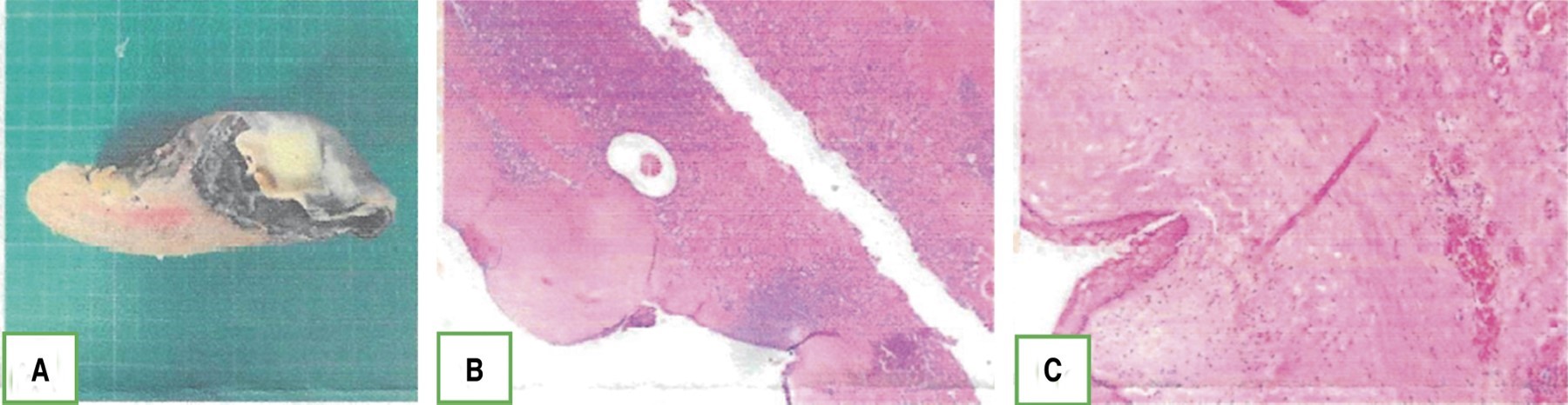 En el reporte histopatológico se describe bazo de 15 × 6 × 5 cm con quiste epidermoide (epitelio escamoso estratificado no queratinizante) de 8 cm con superficie interna trabeculada (Figura 6).