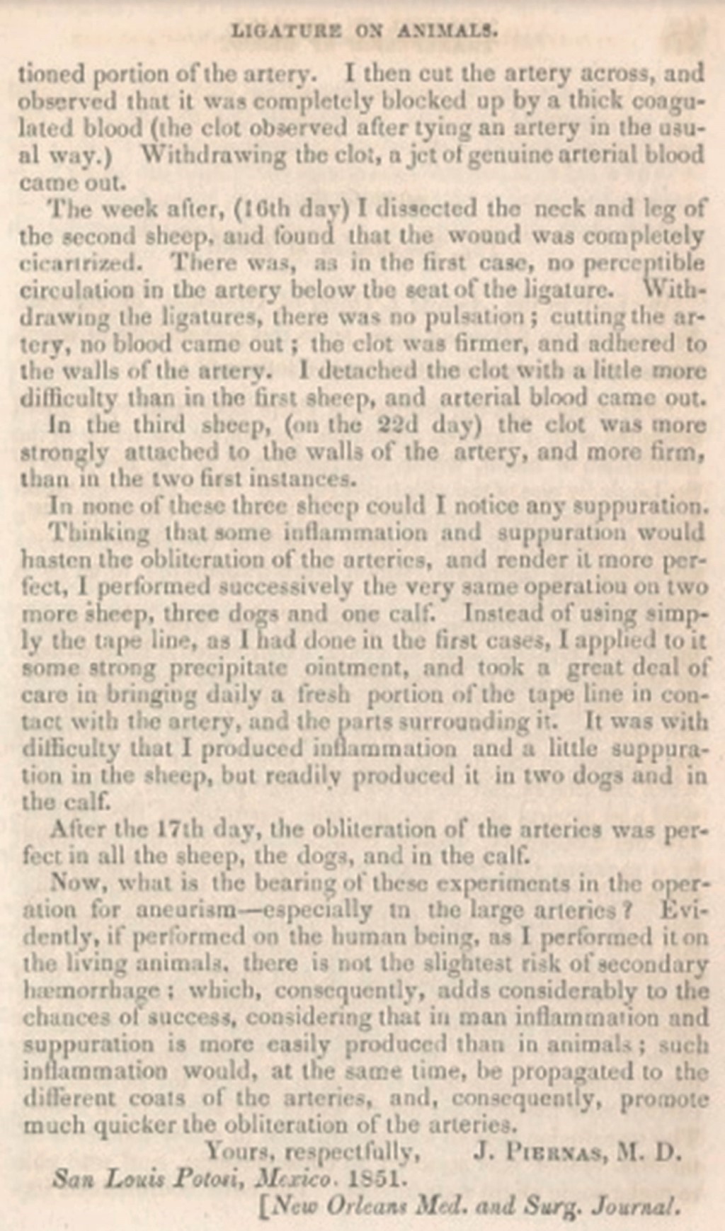 En el artículo, J. Piernas describió que operó tres ovejas vivas, usando sus carótidas y femorales (ambas), realizó en las cuatro arterias una ligadura simple, a los ocho días reintervino, retiro la ligadura y cortó por debajo la arteria, descubriendo que tenía un coagulo firme y sólido por arriba de la ligadura. Lo mismo hizo en dos perros y un ternero y otras dos ovejas con idénticos resultados. No menciona la técnica de abordaje o si usó antisepsia ya que tampoco se describe proceso supurativo.10,22