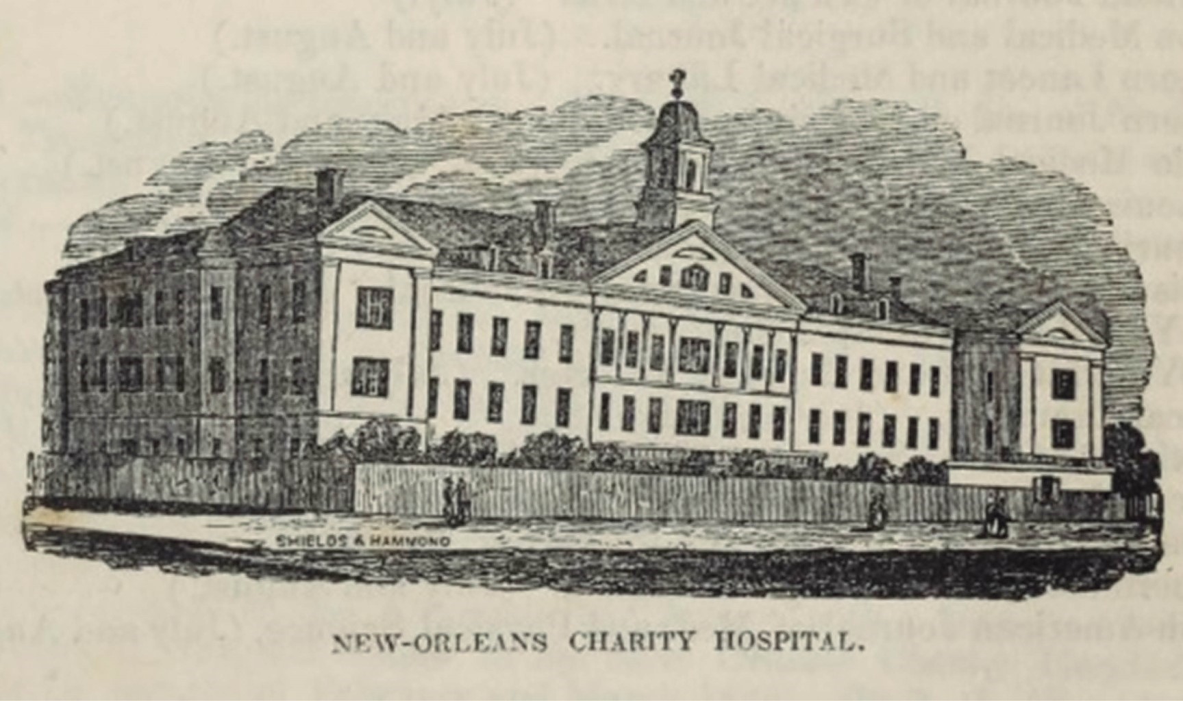 El artículo apareció en la revista norteamericana Northwest Medical and Surgical Journal en 1852 (Figura 1). Referente del autor mencionado como J. Piernas no refiere si fue médico mexicano, cubano o norteamericano, tan sólo que practicó en las salas del Hospital de la Charity de New Orleans (Figura 2) como estudiante;10 dicho hospital fue fundado en 1727 por jesuitas.11 Tampoco tengo referencia en los libros de historia de la medicina en San Luis Potosí respecto de un Dr. J. Piernas que ejerciera en nuestro estado en ese tiempo,12-14 sin tener tampoco referencia si trabajó en nuestro Hospital de San Juan de Dios.15 La descripción de los aneurismas inició en New Orleans en 1844 en la revista New Orleans Medical Journal con el artículo del Dr. M. Malgaigne (1806-1865) de Francia en una ligadura exitosa en dicho año de la arteria iliaca externa traducido del francés al inglés,16 y un artículo del mismo Hospital de la Caridad de Nueva Orleans de 1846 editado por A. J. Wedderburn,17 pero existe un artículo reproducido de Dr. G. W. Norris del Hospital de Philadelphia quien describió desastrosos resultados de dicha ligadura, incluyendo sangrados y amputaciones que llevaron a la muerte los pacientes en esos mismos años,18 sin encontrar más datos respecto del origen de esta iniciativa por el Dr. J. Piernas, queda sin evidencia en dónde surgió la influencia para esta iniciativa, ya que los artículos de la revista en donde él estudio medicina (Universidad de Luisiana) se centran al manejo de abscesos hepáticos, esplenomegalia (habla incluso de un estallamiento espontáneo), entidades cerebrales, el control de la fiebre amarilla (que merece un trabajo de investigación respecto a monitoreo epidemiológico sobre este mal en el siglo XIX), muy en especial cuando los índices se elevan en Cuba y Veracruz, imagino que por la relevancia del comercio en dichos puertos.19 Tampoco encontré indicios de una escuela o línea quirúrgica de cirugía experimental; la revista cambió de nombre en 1846 de New Orleans Medical Journal agregando el de New Orleans Medical and Surgical Journal que se generó en el Hospital de la Caridad de New Orleans. Sólo existe en 1848 un apasionado artículo donde apoya vehementemente las teorías de los cambios del tejido de Bichat y mencionan una vez las propuestas quirúrgicas experimentales de John Hunter;20 es lo único en lo que podría basar esta propuesta tan innovadora. La única posibilidad es que en el Hospital de la Caridad de Nueva Orleans se discutieran los experimentos y propuestas de John Hunter respecto al manejo de aneurismas,3 pero no tengo un sustento, salvo los artículos que describí de casos de aneurismas comentados en la revista de dicho hospital.