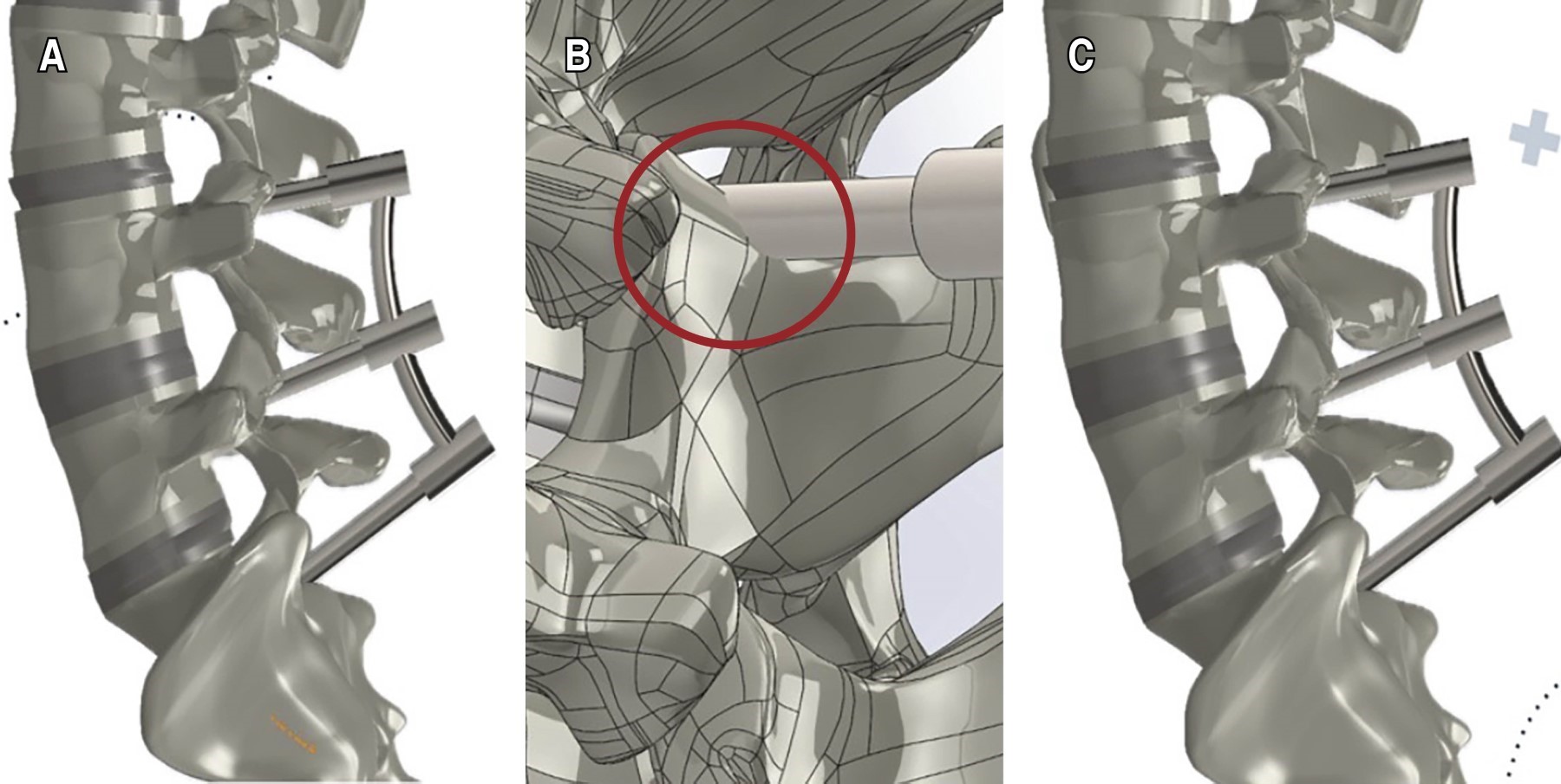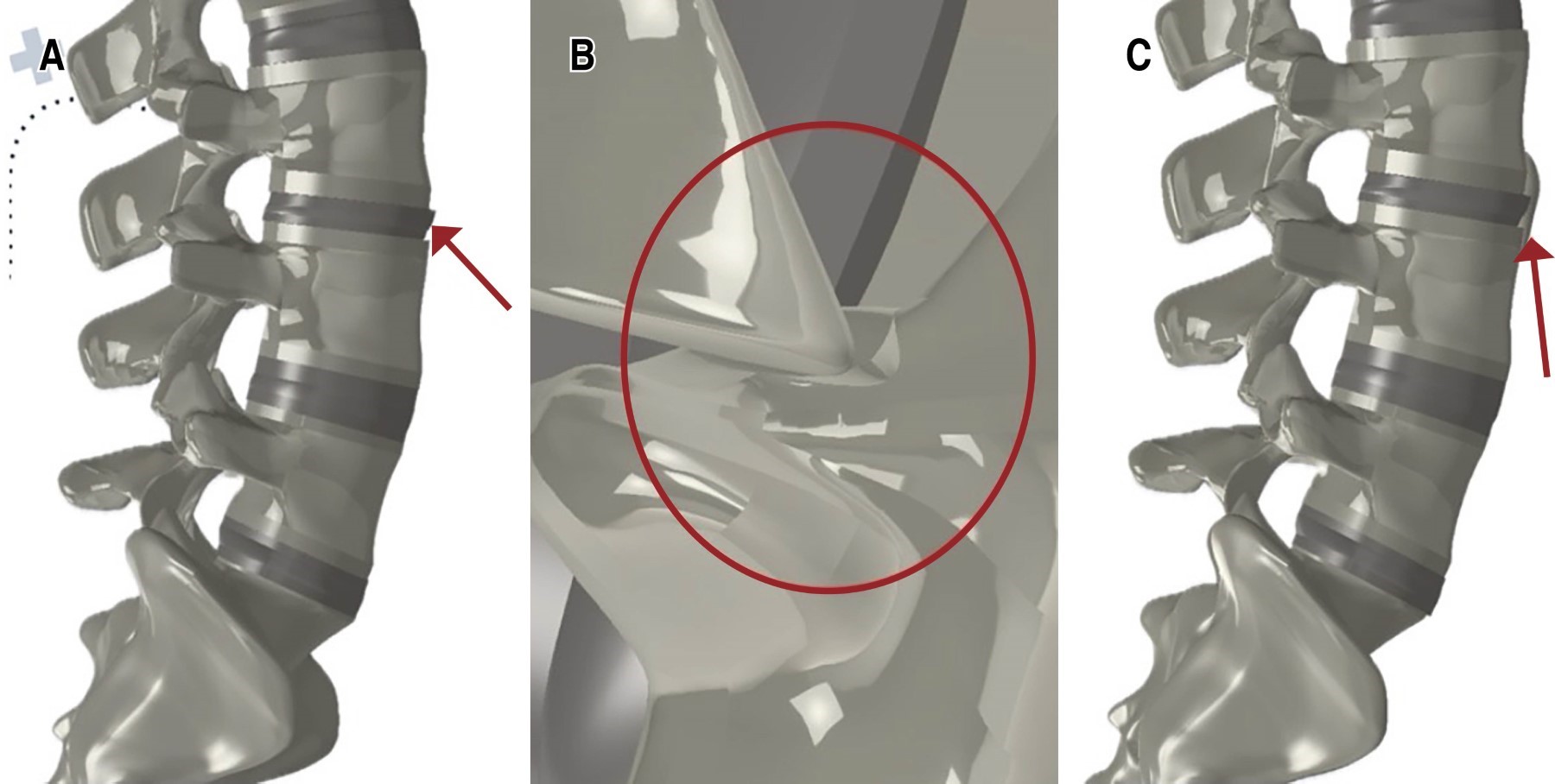 - 3. Tercer paso (modelo 3): se simula una espondiloartrosis anterior entre el cuerpo de L3 y L4 al colocar un puente óseo virtual (osteofitos unidos) (Figura 1C).