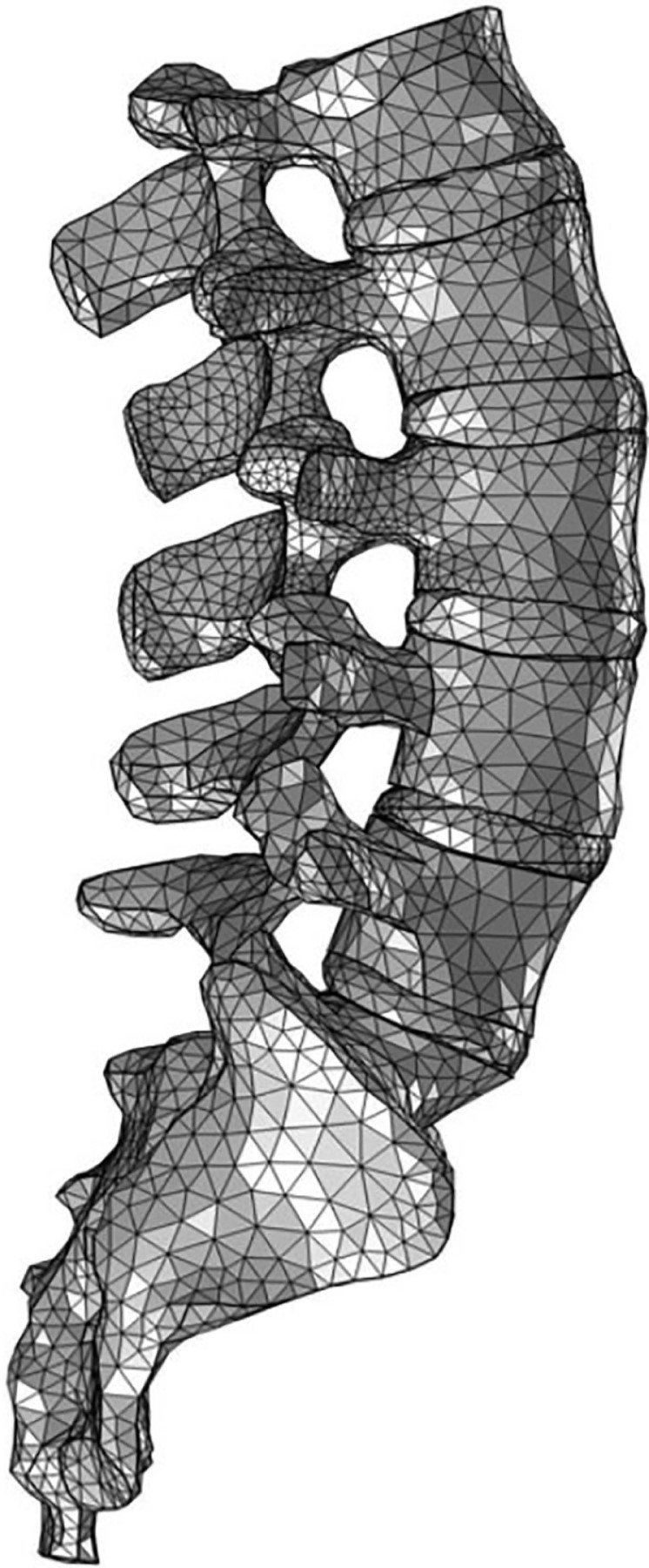 Con base en el modelo sano, se digitalizó un constructo de una columna lumbosacra, constando de cinco vértebras lumbares con sus cuerpos, facetas articulares superiores e inferiores, apófisis transversas, espinosas y láminas, un sacro completo, con disco intervertebral de los segmentos de la primera lumbar (L1) hasta la primera vértebra sacra (S1).