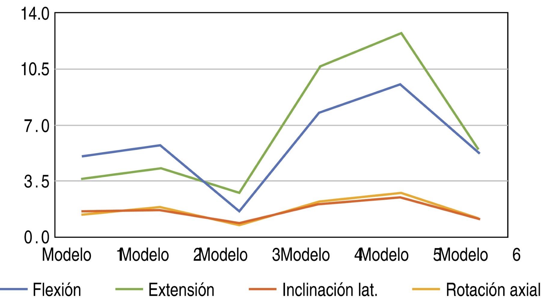 Al someter a estudio un modelo de 210,472 elementos triangulares 65,978 caras y 1,885 aristas, aplicándole una carga de 400 N en la superficie proximal de la primer vértebra lumbar en los seis modelos (degeneración discal, igual más degeneración facetaria, igual más espondiloartrosis con o sin fusión posterior de L4 a S1 en todos los casos) y mediante el sistema COMSOL someterlo a compresión axial, flexoextensión, inclinación lateral y rotación, se obtuvieron los resultados reportados en MPa siguientes (Tabla 2):