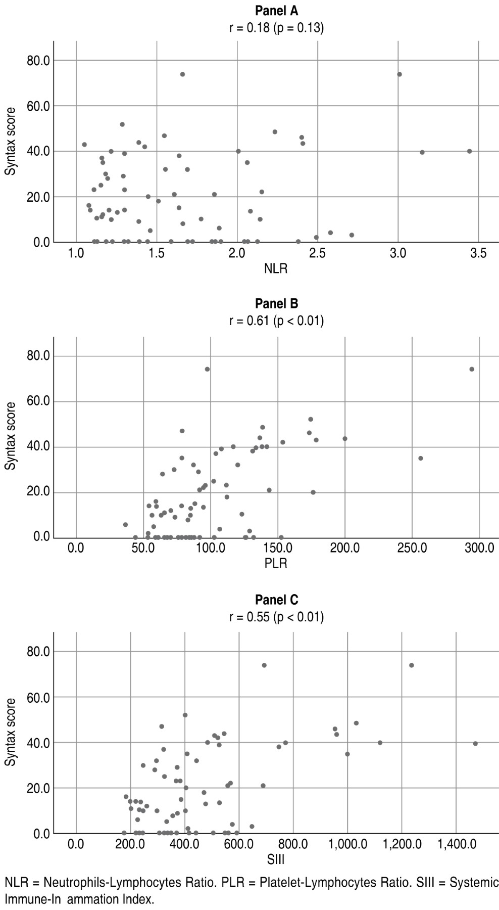3), índice plaquetas linfocitos (PLR) (144.9 ± 54.7) e índice inmunitario-inflamatorio sistémico (IIIS) (703.2 ± 335.9) en los sujetos con puntaje SYNTAX ≥ 33. Se obtuvo una correlación positiva entre el PLR y el puntaje SYNTAX (r = 0.61; p < 0.01), y entre el IIIS y el puntaje SYNTAX (r = 0.55; p < 0.01). En el análisis de regresión lineal múltiple, el IIIS fue el índice más relacionado de manera independiente con el puntaje SYNTAX (β = 0.64; p < 0.01).