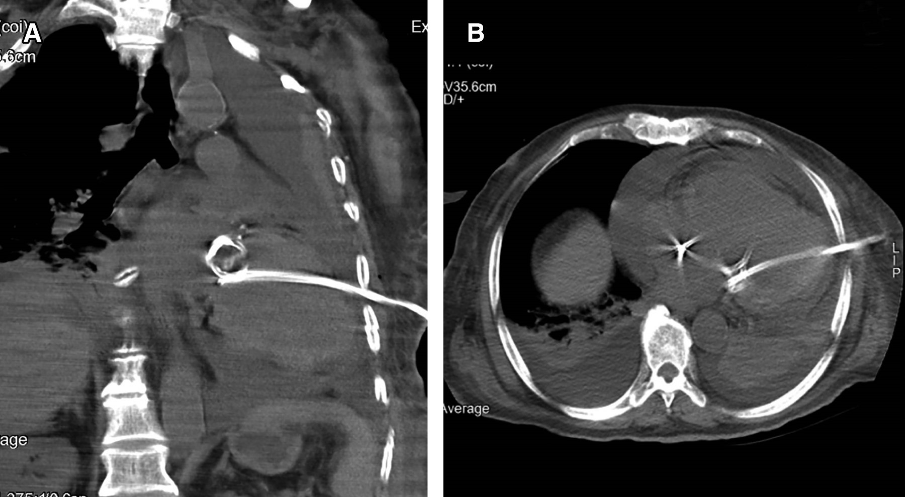 Presentamos el caso de un paciente masculino quien fue tratado en el departamento de urgencias por derrame pleural izquierdo mediante un drenaje torácico. Posterior a la colocación se obtuvo gasto hemático inmediato. Se realizó tomografía de tórax, así como ecocardiograma que evidenció posición de tubo de drenaje en ventrículo izquierdo. Se realizó intervención quirúrgica para el retiro de catéter mediante toracotomía anterior izquierda con extracción exitosa.