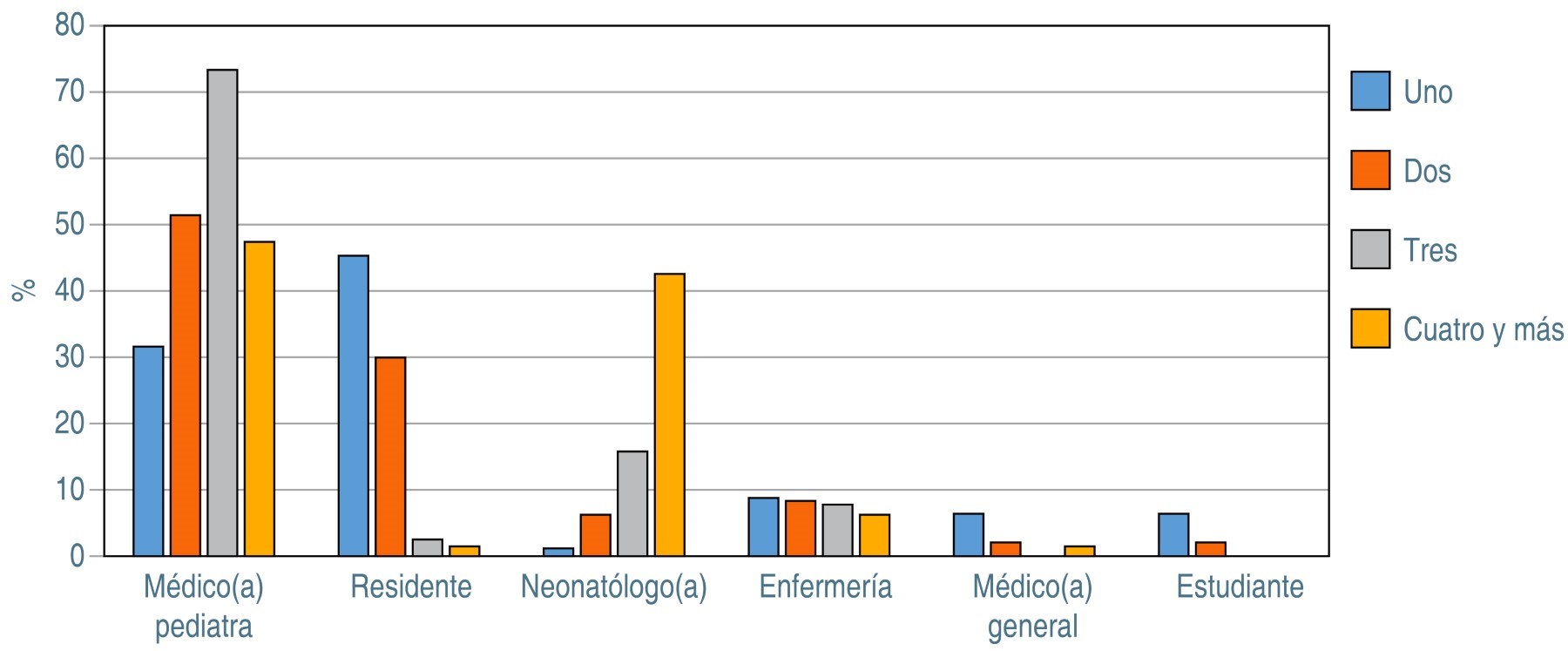 De un total de 480 participantes registrados en la encuesta, 227 cumplieron los criterios de selección y completaron la evaluación práctica. De estos 227, la edad promedio fue de 40 años, pero hubo participantes desde 20 a 71 años. En la Tabla 1 se describen sus características; como se observa, la mayoría eran pediatras (n = 107, 47.1%), seguido de médicos residentes (n = 52, 22.9%) y de neonatólogos (n = 37, 16.3%). Además, un poco más de la mitad (n = 148, 65.2%) refirió haber acreditado el curso de reanimación neonatal más de una vez; sin embargo, como se observa en la Figura 1 la mayor proporción con dos o más cursos fueron los pediatras y neonatólogos.