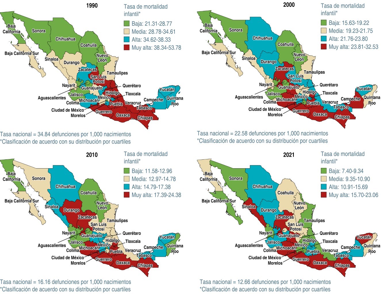 Al observar la distribución geográfica de la mortalidad infantil por entidad federativa, pero agrupadas por cuartiles en función de su magnitud, mostró que Chiapas, Guerrero y Oaxaca fueron las únicas entidades del país que se clasificaron en muy alta mortalidad infantil en las últimas tres décadas. Por su parte, Michoacán y Zacatecas se categorizaron con alta mortalidad en 1990, pero en las siguientes tres décadas escalaron a entidades de muy alta mortalidad. Yucatán se clasificó de alta mortalidad entre 1990 a 2010, pero para el 2021 escaló a la categoría de muy alta mortalidad. Sinaloa tuvo una mortalidad infantil media en 1990 y 2000, alta en 2010 y muy alta en 2021. Finalmente, destaca el caso de Veracruz, que transitó por las cuatro categorías: de mortalidad muy alta en 1990, alta en 2000, media en 2010 y baja en 2021 (Figura 3).