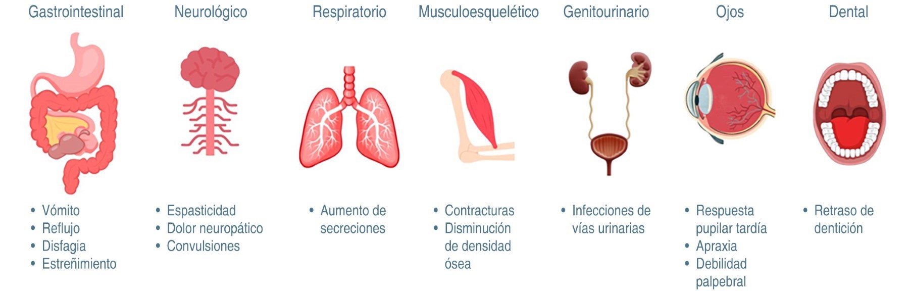 Los pacientes con enfermedad de Krabbe de inicio temprano suelen manifestar un fenotipo más grave y de rápida progresión, caracterizado por espasticidad apendicular, hipotonía axial, irritabilidad, retraso o regresión psicomotora grave, episodios recurrentes de fiebre, y tienen alta mortalidad. En contraste, los pacientes de inicio tardío presentan evolución más lenta, con regresión psicomotora gradual, desarrollo progresivo de paraparesia espástica y alteraciones de la marcha. Independientemente de la forma de presentación, esta enfermedad también puede afectar múltiples órganos y sistemas (Figura 1).8-13