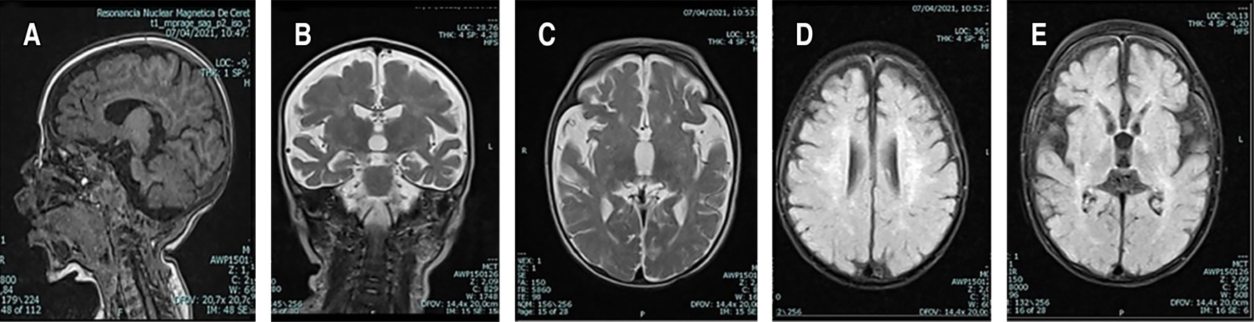 Se descartó neuroinfección y se suspendió el esquema antimicrobiano. Se realizó RMC, cuyas imágenes se presentan en la Figura 2. También se realizó electroencefalograma por presencia de posturas anormales persistentes, en el cual se reportó lentificación moderada de los ritmos de fondo, posiblemente relacionados con el uso de medicamentos (benzodiacepinas o barbitúricos), pero sin actividad ictal.