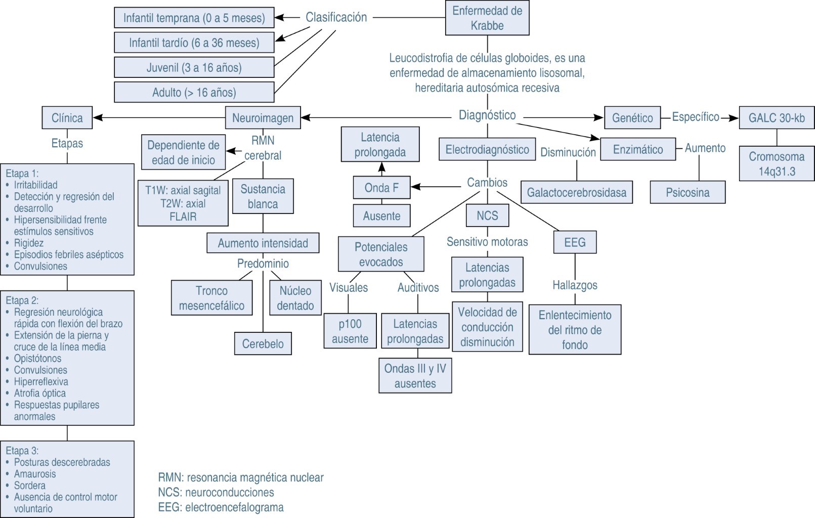 El diagnóstico se basa en la sospecha clínica y en hallazgos de resonancia magnética cerebral (RMC), en la cual se evidencian alteraciones en la sustancia blanca y sustancia gris.14 Además, en los estudios de neuroconducción se presenta reducción en la velocidad de conducción nerviosa, tanto sensitiva como motora.15 Cuando se sospecha esta enfermedad, se requiere la medición de la actividad de la enzima GALC en leucocitos o cultivos de fibroblastos; mientras que el análisis molecular permite confirmar el diagnóstico.16,17
