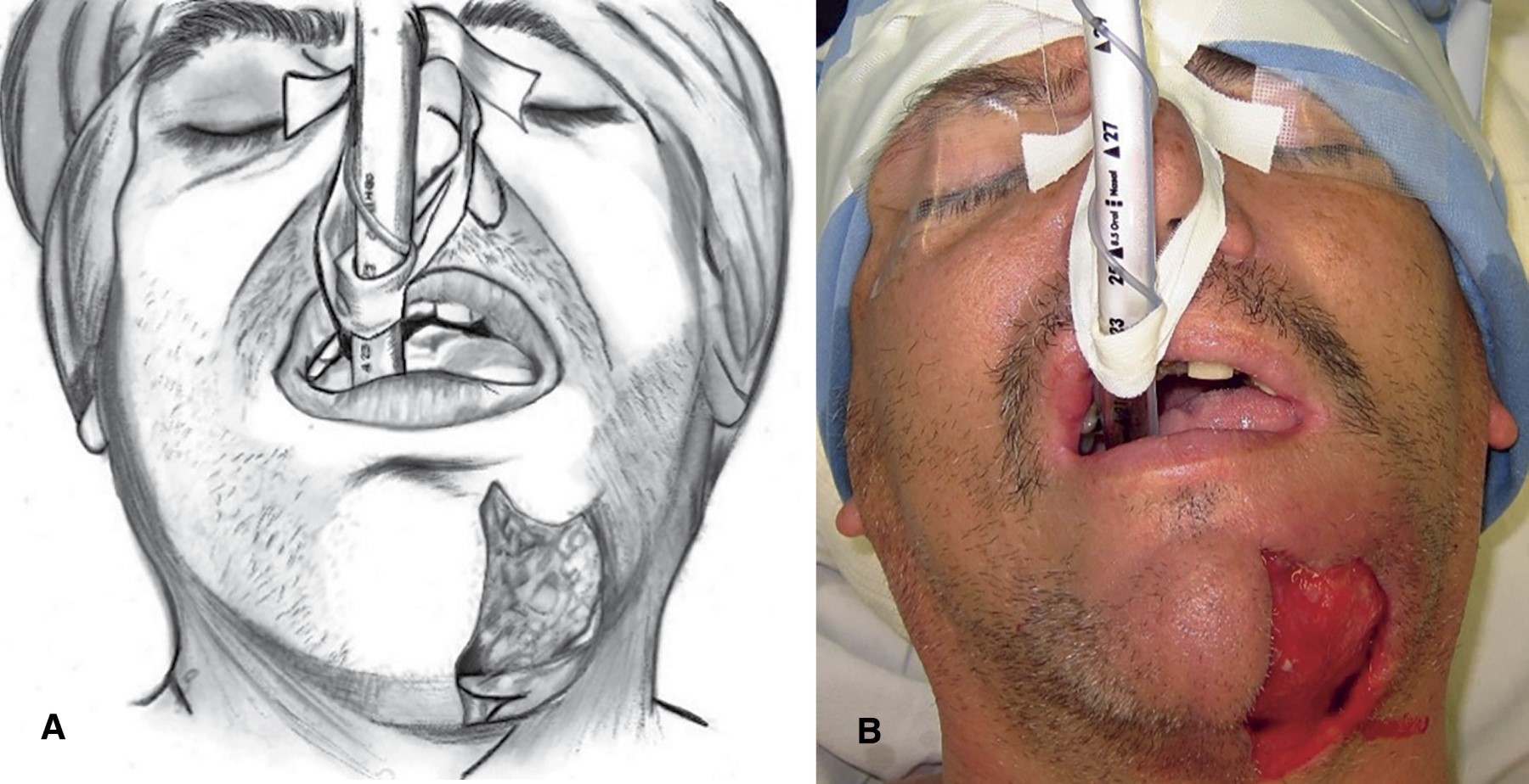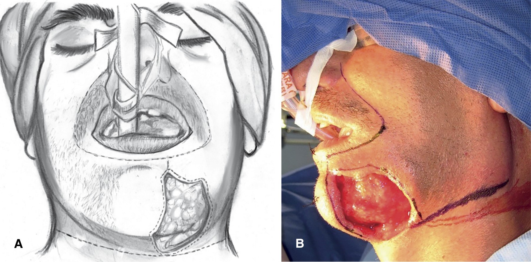 En este artículo se desarrollará y describirá la técnica quirúrgica del colgajo cervicofacial bilateral para la reconstrucción de la región mentoniana y submentoniana, técnica originada para la reconstrucción de un paciente de secuelas por fascitis necrotizante (Figura 1A).