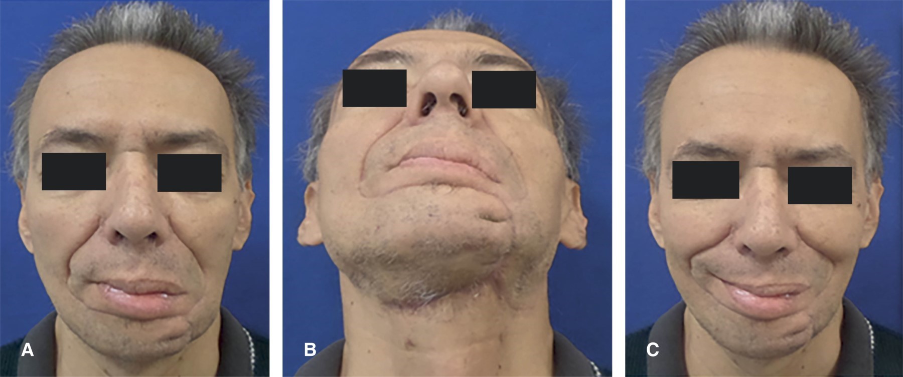 Se muestra control postquirúrgico de tres meses de evolución, donde se observa paresia de los músculos depresores de la comisura labial izquierda por lesión infecciosa ocasionada por la fascitis necrotizante al nervio marginal del VII par craneal (Figura 7A-C).