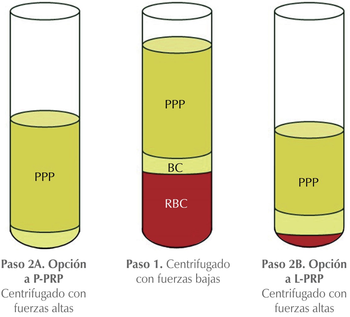 Según el recuento de glóbulos blancos (white blood cells, WBC) y glóbulos rojos (red blood cells, RBC) incluidos en las preparaciones de PRP, se clasifican las preparaciones de PRP en dos tipos de la siguiente manera: P-PRP y L-PRP (Figura 1).15,16