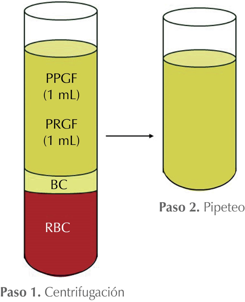 Anitua18,19 realizó un protocolo para preparar plasma puro rico en plaquetas que posteriormente se comercializó como plasma rico en factores de crecimiento (PRGF) o también llamado preparación rica en factores de crecimiento denominado sistema Endoret por el Instituto de Biotecnología en España). El protocolo consiste en obtener sangre varios minutos antes de iniciar la cirugía previo a la administración de la anestesia. Se extrae de 10 a 20 mL de sangre de cada paciente utilizando tubos de 5 mL que contienen una solución de citrato trisódico al 10% como anticoagulante. Los tubos se centrifugan a 160 G durante seis minutos a temperatura ambiente. La sangre se separa así en sus tres componentes básicos: los glóbulos rojos, que aparecen en el fondo del tubo; PRGF en el medio del tubo; y plasma pobre en factores de crecimiento (PPGF) en la parte superior del tubo. Se descarta 1 mL de PRGF de cada tubo de 5 mL. El plasma restante se recoge, incluidos los 1 a 2 mm superiores de la fase de sangre roja y se transfiere a tubos Eppendorf, y se agregan 50 μL de cloruro de calcio al 10% a cada tubo que contiene 1.2 mL de PRGF. Después de 15 a 20 minutos se forma un gel de PRGF. El tiempo de retardo entre la formación del gel PRGF y el llenado del defecto es entre 5 y 10 minutos (Figura 2).17,20