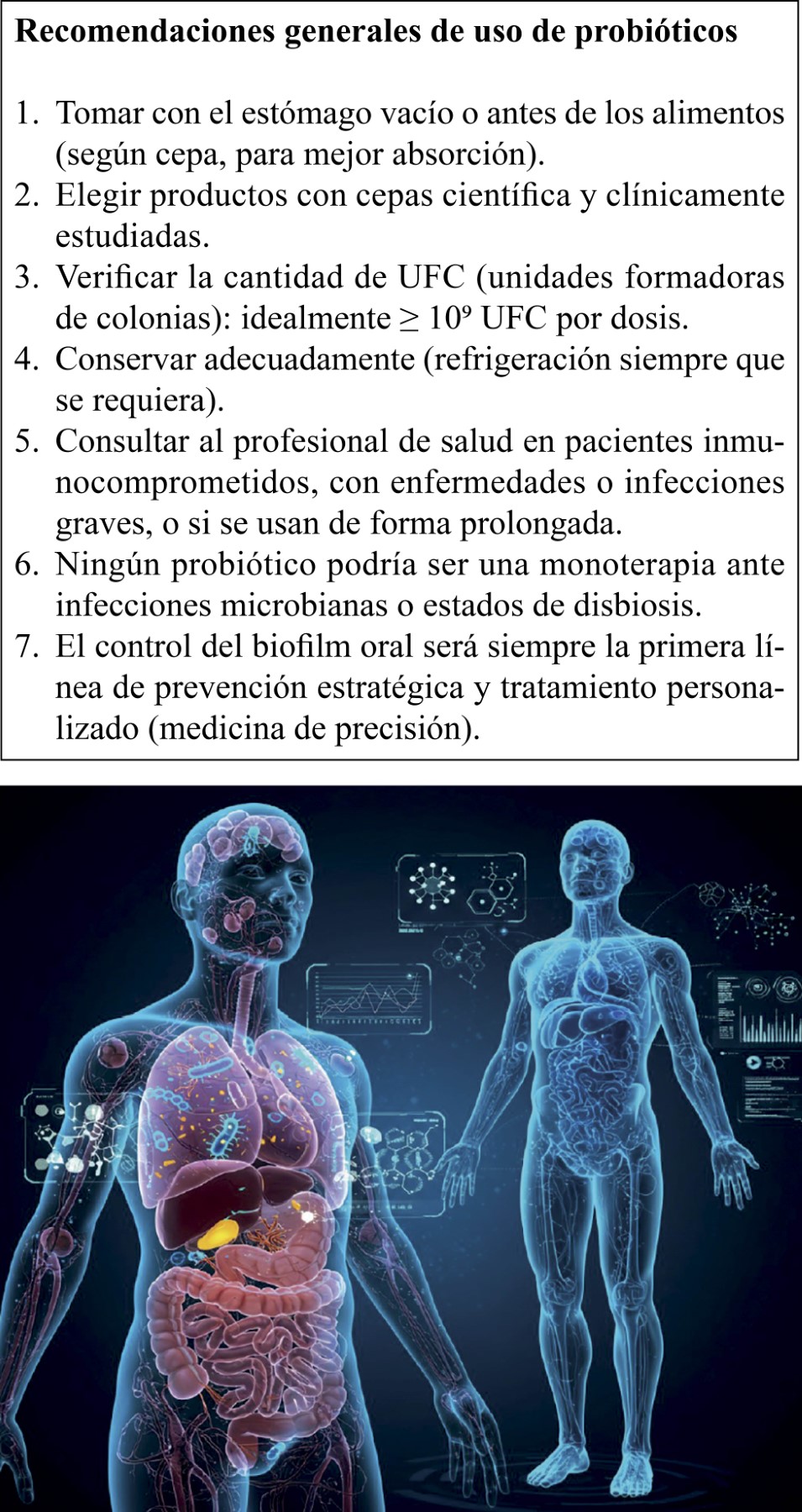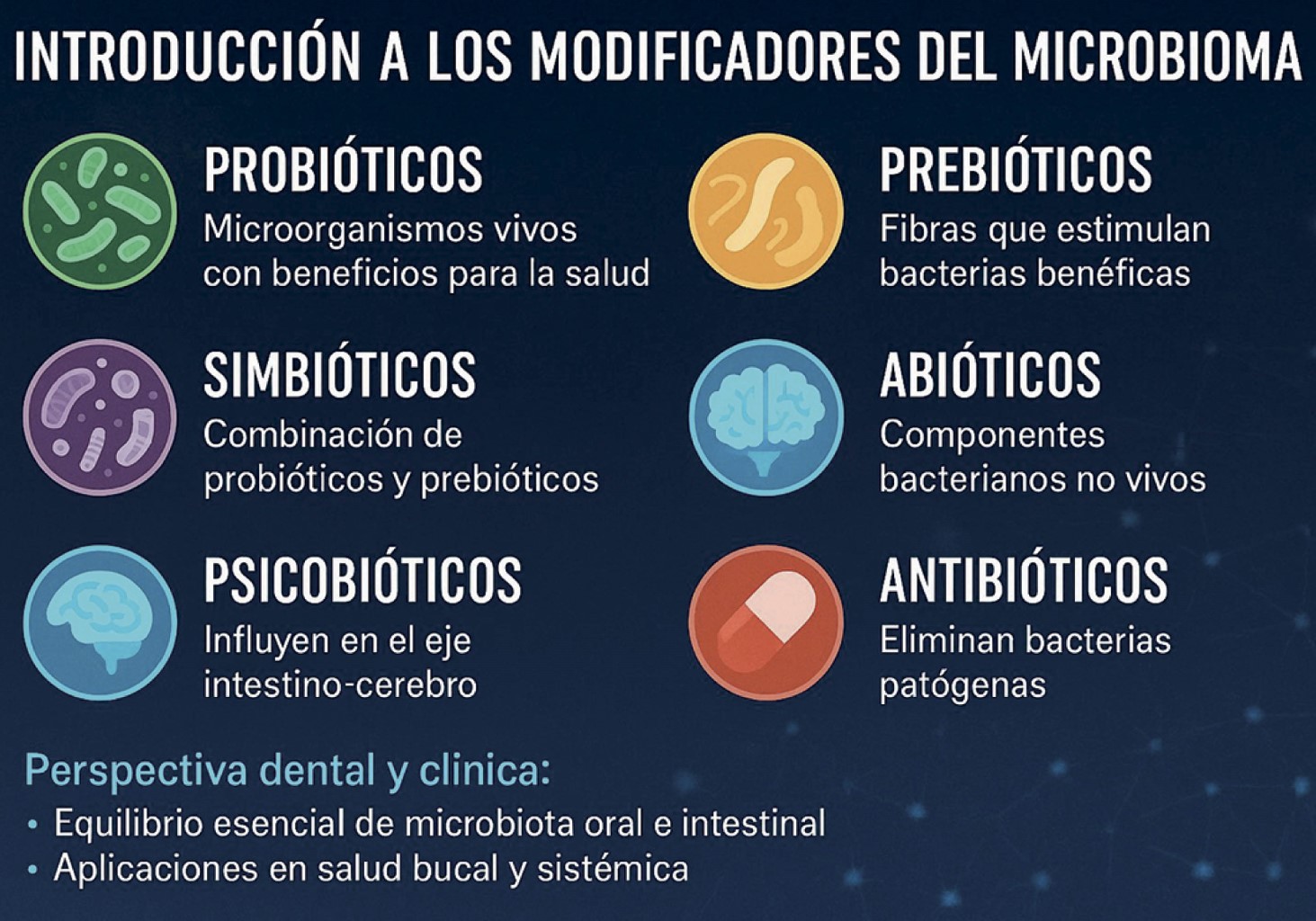 La salud oral es un aspecto crucial de nuestro bienestar general, donde el equilibrio del microbioma oral juega un papel determinante en la homeostasis global. El ecosistema microbiano está compuesto por amplia variedad de bacterias, virus, hongos y arqueas que pueden influir significativamente en la aparición de enfermedades en la cavidad oral, tal como la caries y las enfermedades periodontales. En este contexto, el uso racional de estrategias bióticas como los probióticos, prebióticos, simbióticos, abióticos y psicobióticos presentan una alternativa prometedora para restaurar el equilibrio promovente de la salud. Salud oral es salud sistémica.