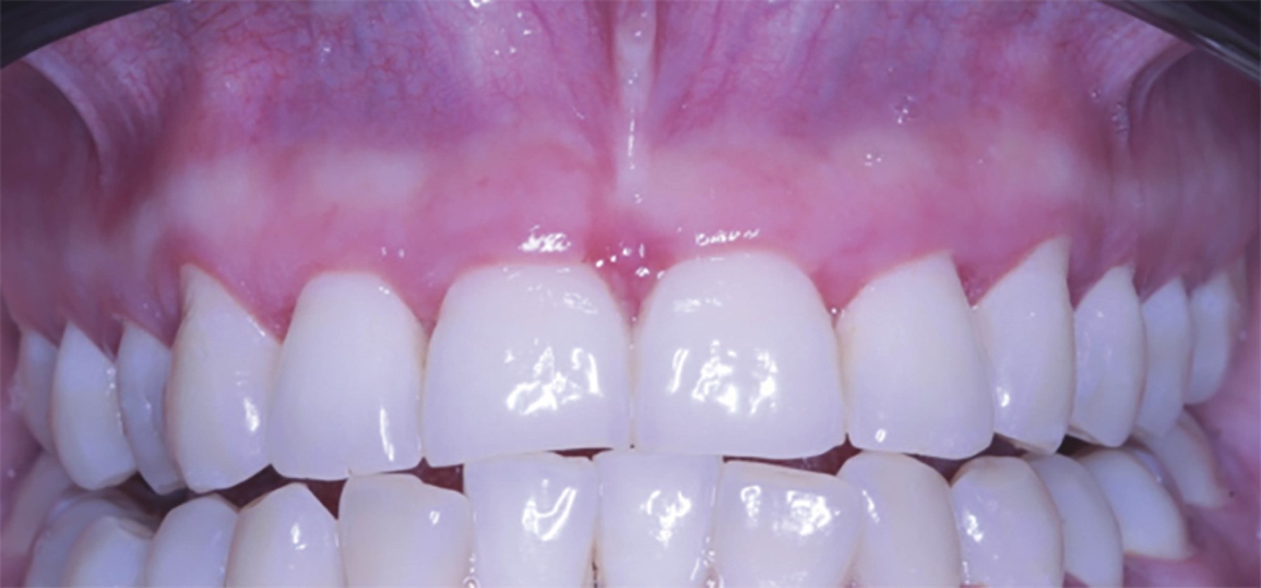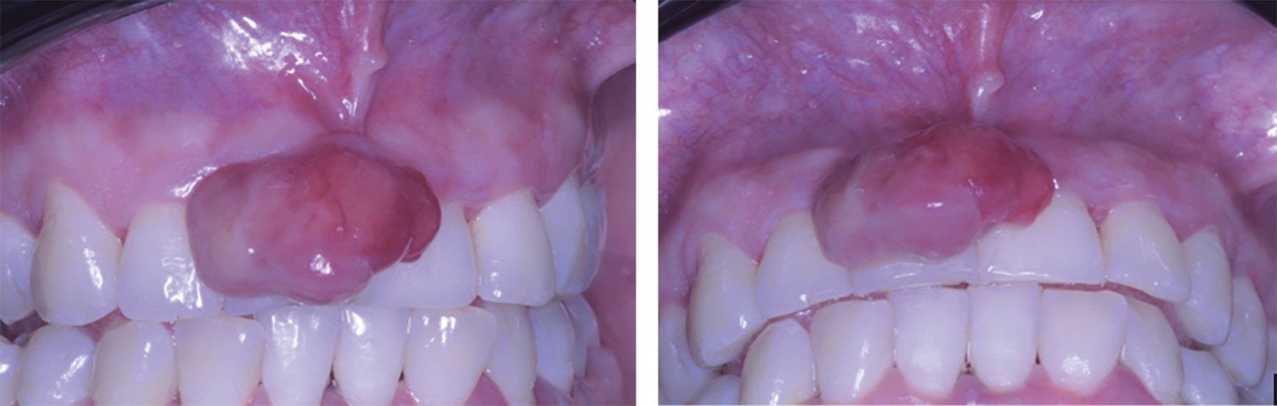Se trata de paciente femenino de 31 años, quien acude a la Clínica de Enseñanza Comunitaria de la Universidad Autónoma de Sinaloa por presentar en los dientes centrales un aumento de volumen en la zona vestibular de la arcada superior. A la anamnesis, la paciente no presenta antecedentes heredofamiliares de relevancia para su padecimiento actual. El examen intraoral reveló una masa gingival de forma ovalada, pediculada, eritematosa, no dolorosa, firme a la palpación y aproximadamente de 18 × 13 mm presente en la encía interdental en relación con los centrales superiores. Lesión asintomática y sin mostrar evidencia clínica de ulceración (Figura 1).