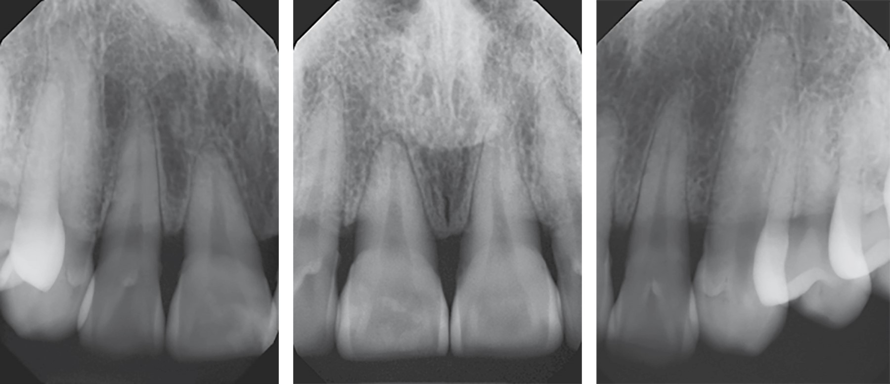 En la radiografía periapical intraoral se observa pérdida ósea de alrededor del 30% en relación a los órganos dentarios 11, 12, 21 y 22. No se observan radiopacidades dentro de la tumoración de partes blandas (Figura 2).