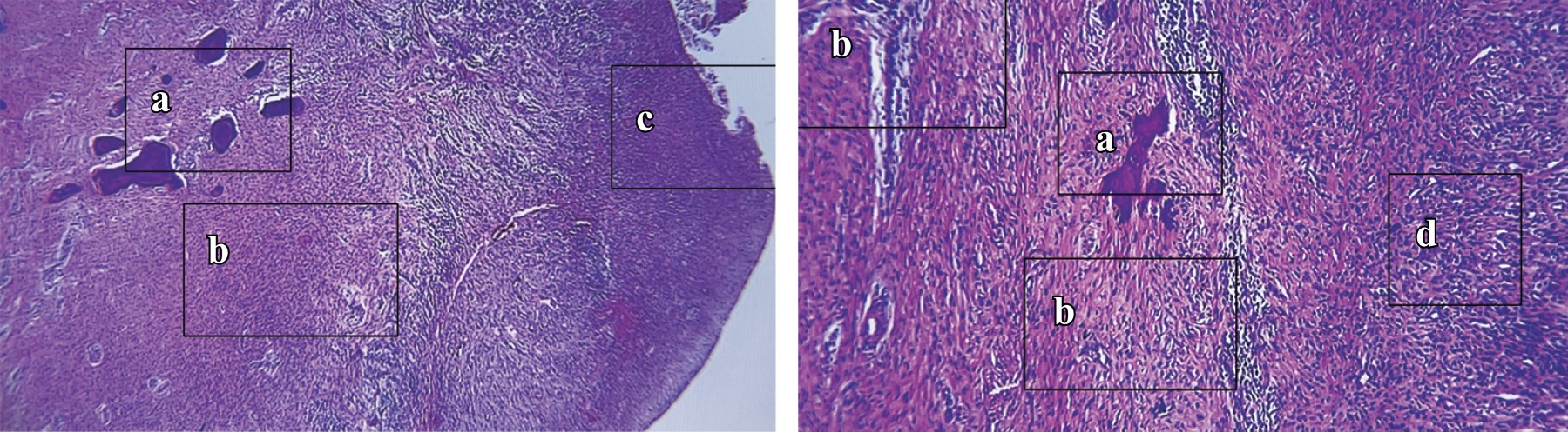 Histopatológicamente, el FOP se describe como una lesión con un estroma fibroso en el que se encuentran presentes tejidos mineralizados como hueso y/o cemento. El material mineralizado puede ser hueso laminar o reticular.12