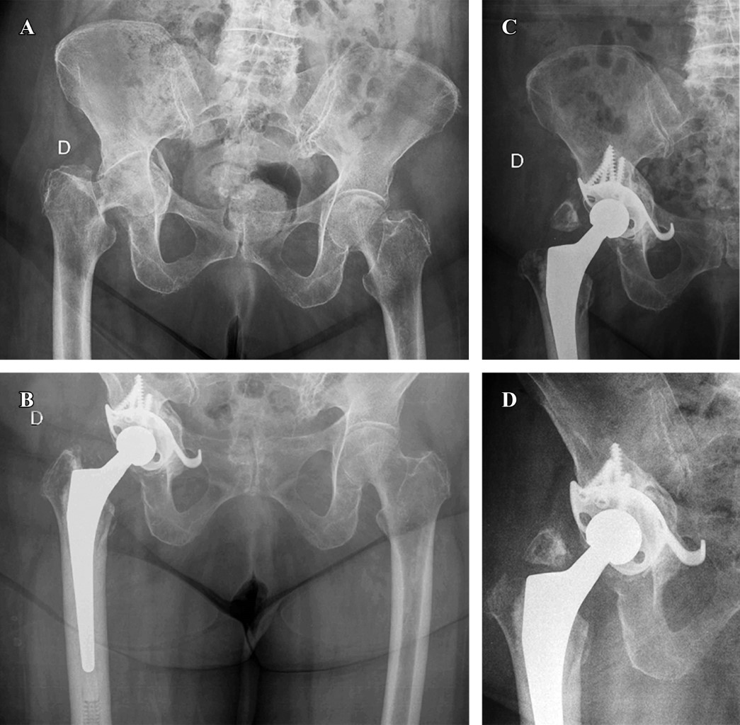 Estudio retrospectivo, obtenido de una base de datos prospectiva de un hospital terciario español, que incluyó a los pacientes mayores de 65 años con fractura acetabular, tratados con prótesis total de cadera entre Mayo de 2008 y Mayo de 2018, con seguimiento mínimo de un año y máximo de 10 años. Para la formalización del presente estudio no fue necesaria aprobación ética por su característica retrospectiva y dado que todos los pacientes firman el consentimiento informado de inclusión en esa base de datos. Se excluyeron aquellos pacientes manejados de manera conservadora por no cumplir criterios quirúrgicos (desplazamiento menor a 2 mm, congruencia articular, superficie de carga conservada y articulación estable)12,13 y aquellos a quienes se les efectuó una reducción abierta y osteosíntesis. Finalmente fueron siete pacientes los que recibieron una prótesis total de cadera como tratamiento.
